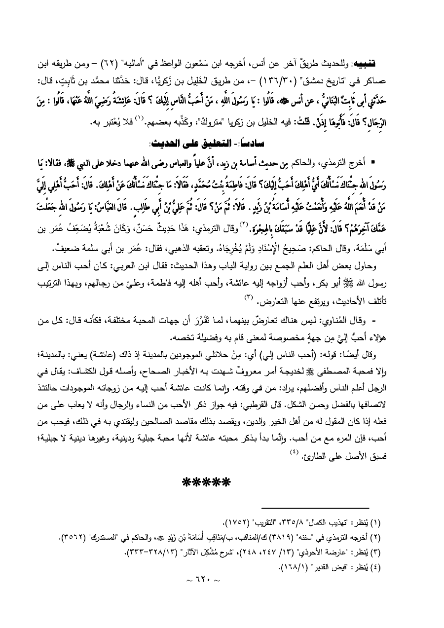 - وقال المُناوي: ليس هناك تعارضٌ بينهما، لما تَقَرَّرَ أن جهات المحبة مختلفة، فكأنه قال: كل من هؤلاء أحبُّ إليَّ مِن جهةٍ مخصوصة لمعنى قام به وفضيلة تخصه.