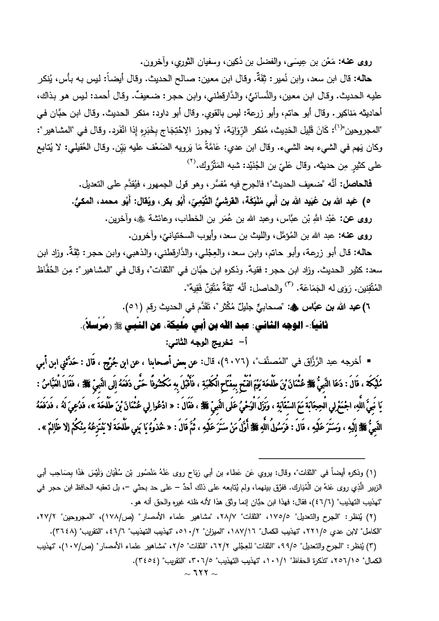 (¬١) وذكره أيضاً في "الثقات"، وقال: يروي عَن عَطاء بن أبي رَبَاح روى عَنْهُ مَنْصُور بْن سُفْيَان وَلَيْسَ هَذَا بِصَاحِب أبي الزبير الَّذِي روى عَنهُ بن الْمُبَارك. ففرَّق بينهما، ولم يُتابعه على ذلك أحدٌ - على حد بحثي -، بل تعقبه الحافظ ابن حجر في "تهذيب التهذيب" (٦/ ٤٦)، فقال: فهذا ابن حبَّان إنما وثق هذا لأنه ظنه غيره والحق أنه هو.