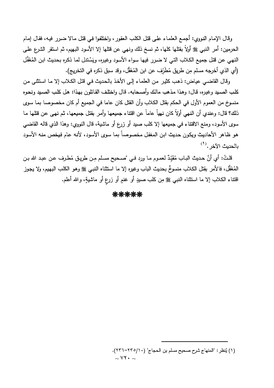 وقال الإمام النووي: أجمع العلماء على قتل الكلب العقور، واختلفوا في قتل مالا ضرر فيه، فقال إمام الحرمين: أمر النبي - صلى الله عليه وسلم - أولاً بقتلها كلها، ثم نسخ ذلك ونهي عن قتلها إلا الأسود البهيم، ثم استقر الشرع على النهي عن قتل جميع الكلاب التي لا ضرر فيها سواء الأسود وغيره، ويَسْتدل لما ذكره بحديث ابن المُغَفَّل (أي الذي أخرجه مسلم مِن طريق مُطَرِّف عن ابن المُغَفَّل، وقد سبق ذكره في التخريج).