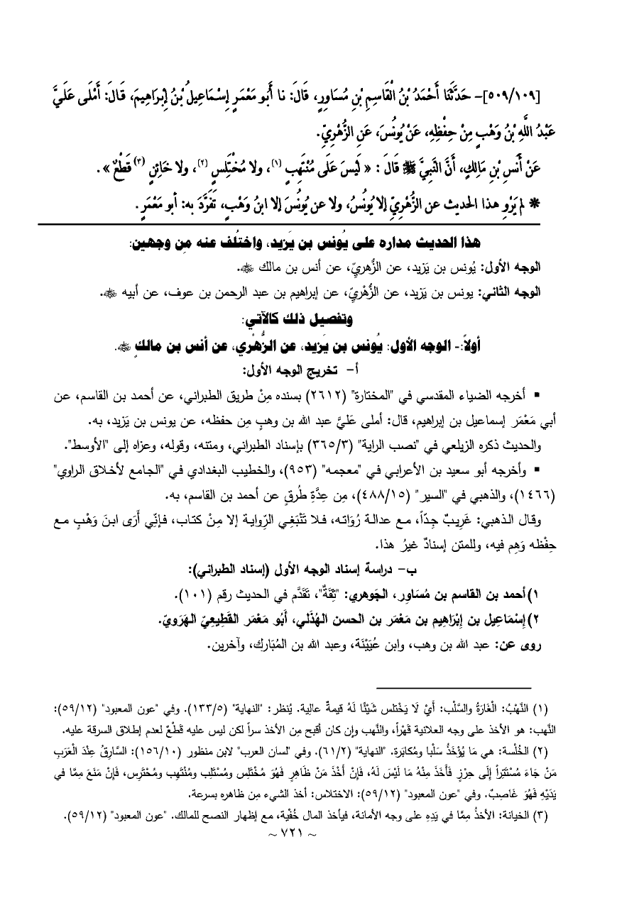 * لم يَرْوِ هذا الحديث عن الزُّهْرِيِّ إلا يُونُسُ، ولا عن يُونُسَ إلا ابنُ وَهْبٍ، تَفَرَّدَ به: أبو مَعْمَرٍ.