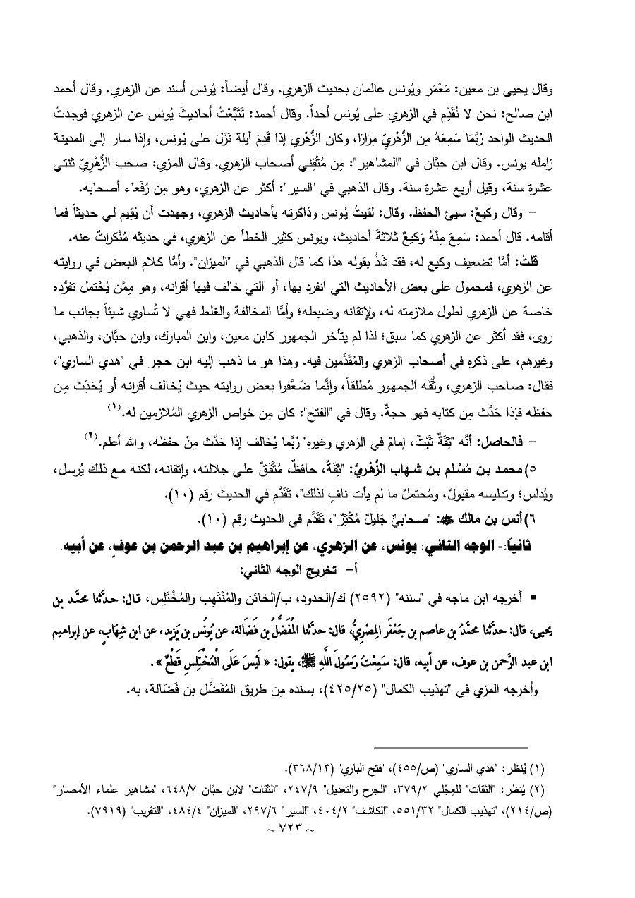 قلتُ: أمَّا تضعيف وكيع له، فقد شَذَّ بقوله هذا كما قال الذهبي في "الميزان". وأمَّا كلام البعض في روايته عن الزهري، فمحمول على بعض الأحاديث التي انفرد بها، أو التي خالف فيها أقرانه، وهو مِمَّن يُحْتمل تفرُّده خاصة عن الزهري لطول ملازمته له، ولإتقانه وضبطه؛ وأمَّا المخالفة والغلط فهي لا تُساوي شيئاً بجانب ما روى، فقد أكثر عن الزهري كما سبق؛ لذا لم يتأخر الجمهور كابن معين، وابن المبارك، وابن حبَّان، والذهبي، وغيرهم، على ذكره في أصحاب الزهري والمُقَدَّمين فيه. وهذا هو ما ذهب إليه ابن حجر في "هدي الساري"، فقال: صاحب الزهري، وثَّقَه الجمهور مُطلقاً، وإنَّما ضَعَّفوا بعض روايته حيث يُخالف أقرانه أو يُحَدِّث مِن حفظه فإذا حَدَّث مِن كتابه فهو حجةٌ. وقال في "الفتح": كان مِن خواص الزهري المُلازمين له. (¬١)