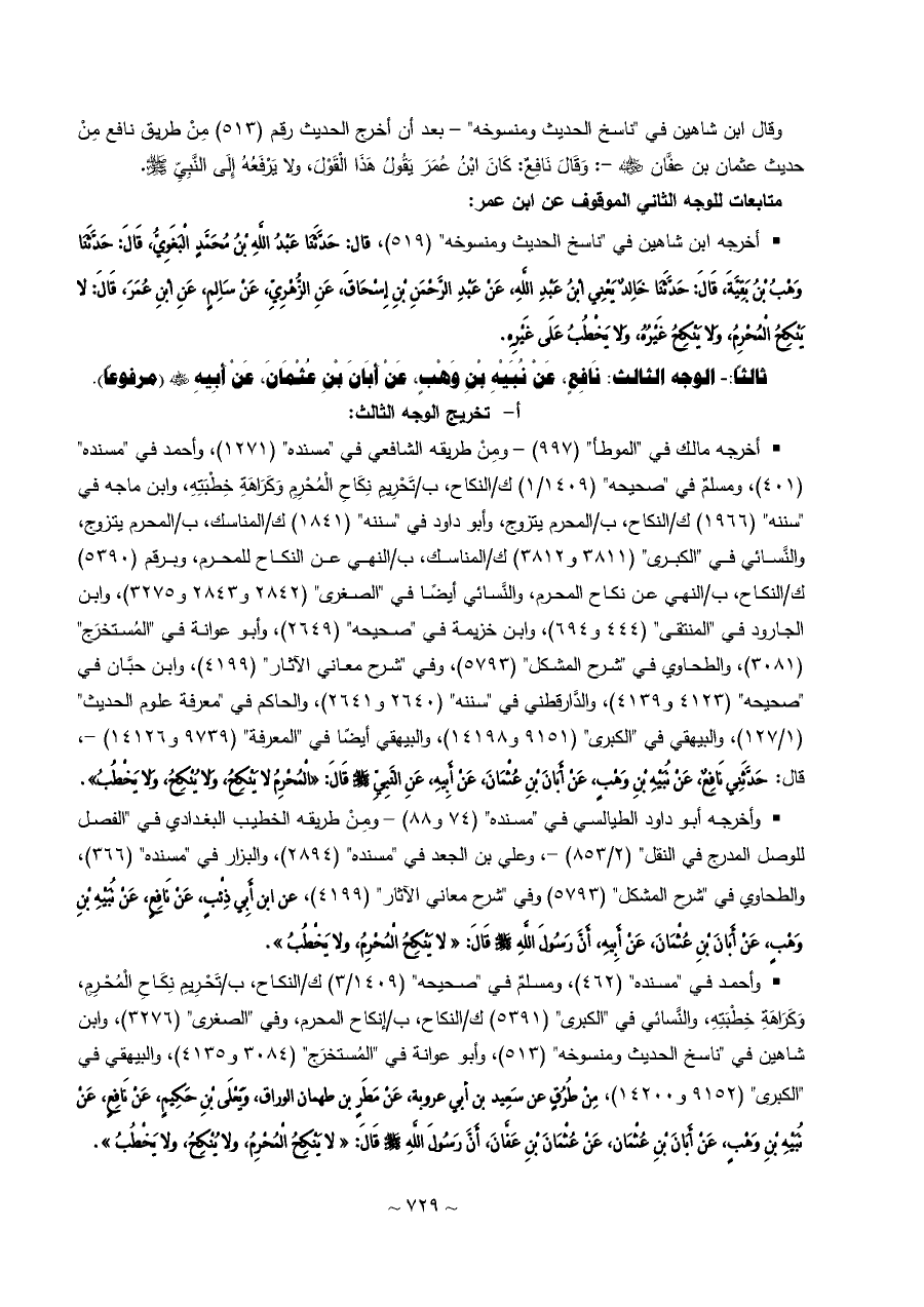 وقال ابن شاهين في "ناسخ الحديث ومنسوخه" - بعد أن أخرج الحديث رقم (٥١٣) مِنْ طريق نافع مِنْ حديث عثمان بن عفَّان - رضي الله عنه -: وَقَالَ نَافِعٌ: كَانَ ابْنُ عُمَرَ يَقُولُ هَذَا الْقَوْلَ، ولا يَرْفَعُهُ إِلَى النَّبِيِّ - صلى الله عليه وسلم -.