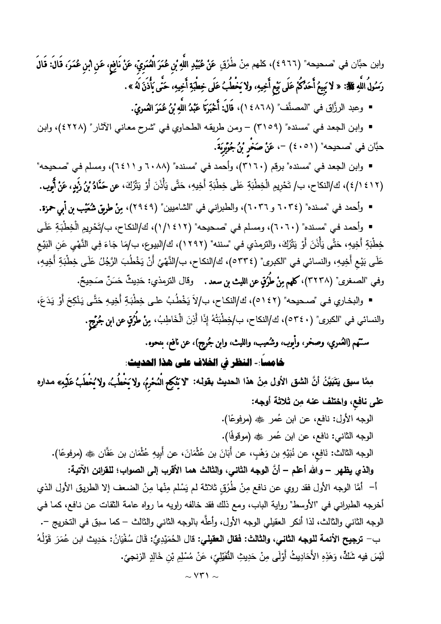 وابن حبَّان في "صحيحه" (٤٩٦٦)، كلهم مِنْ طُرُقٍ عَنْ عُبَيْدِ اللَّهِ بْنِ عُمَرَ الْعُمَرِيِّ، عَنْ نَافِعٍ، عَنِ ابْنِ عُمَرَ، قَالَ: قَالَ رَسُولُ اللَّهِ - صلى الله عليه وسلم -: «لا يَبِيعُ أَحَدُكُمْ عَلَى بَيْعِ أَخِيهِ، ولا يَخْطُبُ عَلَى خِطْبَةِ أَخِيهِ، حَتَّى يَأْذَنَ لَهُ».