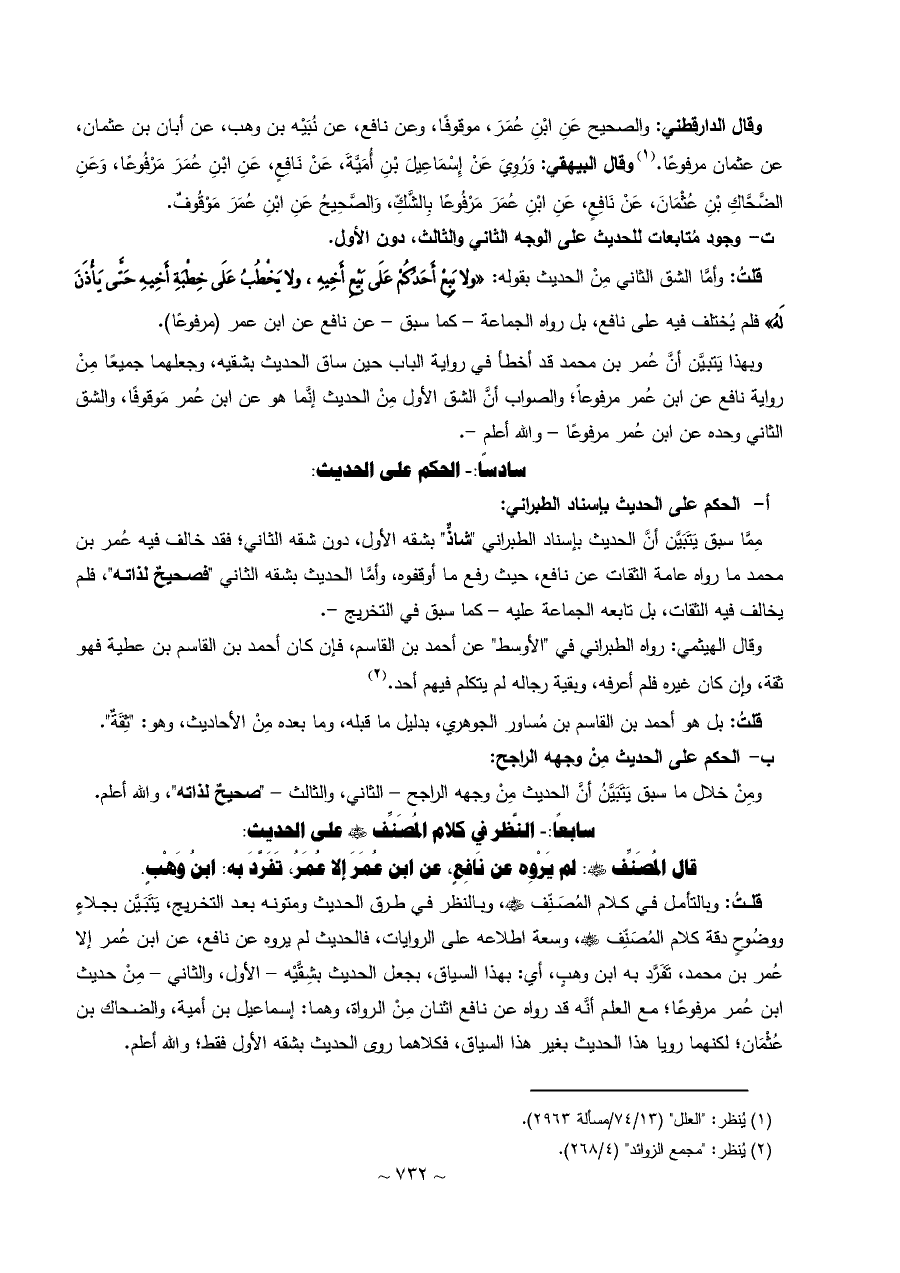 قلتُ: وأمَّا الشق الثاني مِنْ الحديث بقوله: «ولا يَبِعْ أَحَدُكُمْ عَلَى بَيْعِ أَخِيهِ، ولا يَخْطُبُ عَلَى خِطْبَةِ أَخِيهِ حَتَّى يَأْذَنَ لَهُ» فلم يُختلف فيه على نافع، بل رواه الجماعة - كما سبق - عن نافع عن ابن عمر (مرفوعًا).