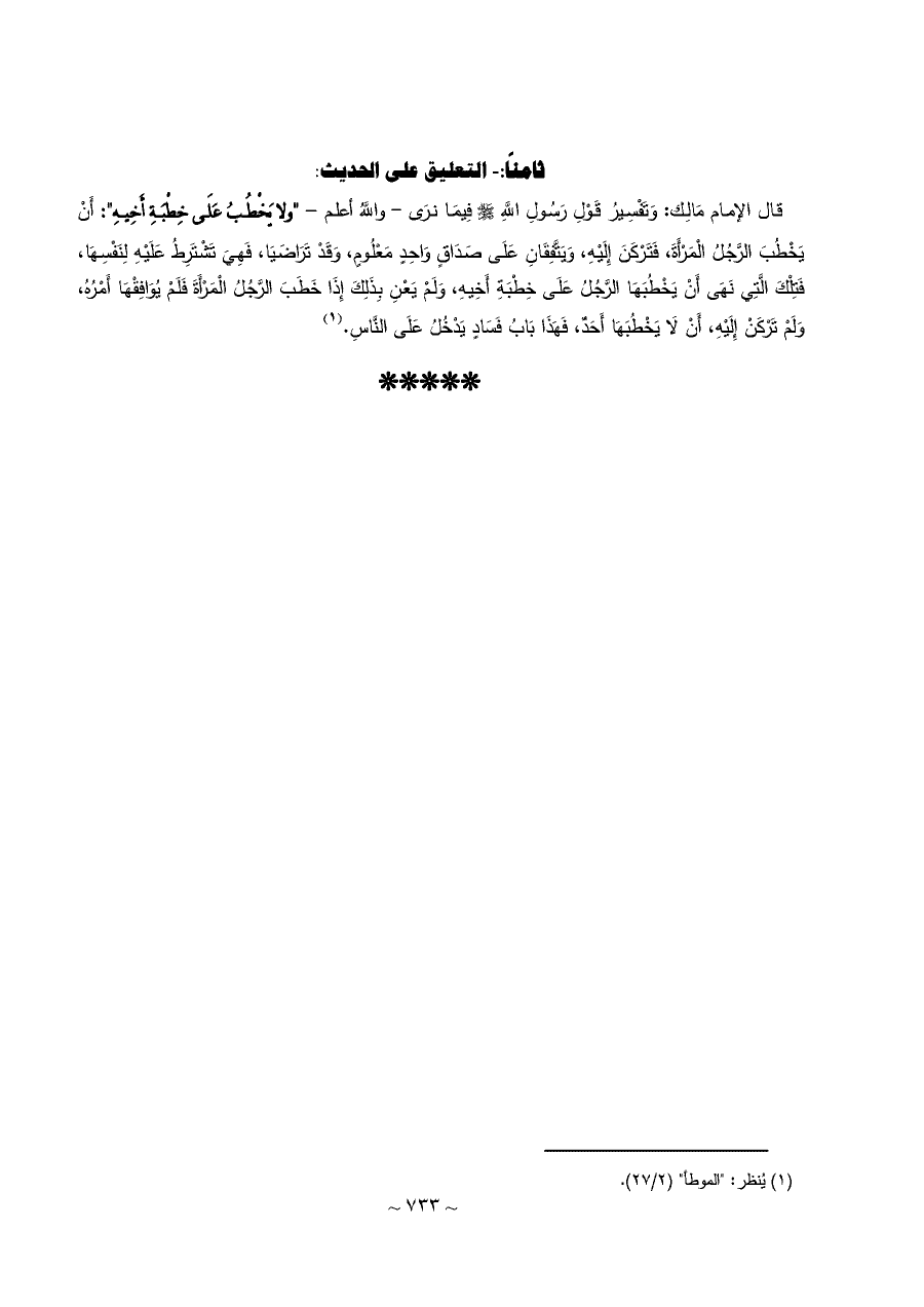 قال الإمام مَالِك: وَتَفْسِيرُ قَوْلِ رَسُولِ اللَّهِ - صلى الله عليه وسلم - فِيمَا نرَى - واللَّهُ أعلم - "ولا يَخْطُبُ عَلَى خِطْبَةِ أَخِيهِ": أَنْ يَخْطُبَ الرَّجُلُ الْمَرْأَةَ، فَتَرْكَنَ إِلَيْهِ، وَيَتَّفِقَانِ عَلَى صَدَاقٍ وَاحِدٍ مَعْلُومٍ، وَقَدْ تَرَاضَيَا، فَهِيَ تَشْتَرِطُ عَلَيْهِ لِنَفْسِهَا، فَتِلْكَ الَّتِي نَهَى أَنْ يَخْطُبَهَا الرَّجُلُ عَلَى خِطْبَةِ أَخِيهِ، وَلَمْ يَعْنِ بِذَلِكَ إِذَا خَطَبَ الرَّجُلُ الْمَرْأَةَ فَلَمْ يُوَافِقْهَا أَمْرُهُ، وَلَمْ تَرْكَنْ إِلَيْهِ، أَنْ لَا يَخْطُبَهَا أَحَدٌ، فَهَذَا بَابُ فَسَادٍ يَدْخُلُ عَلَى النَّاسِ. (¬١)