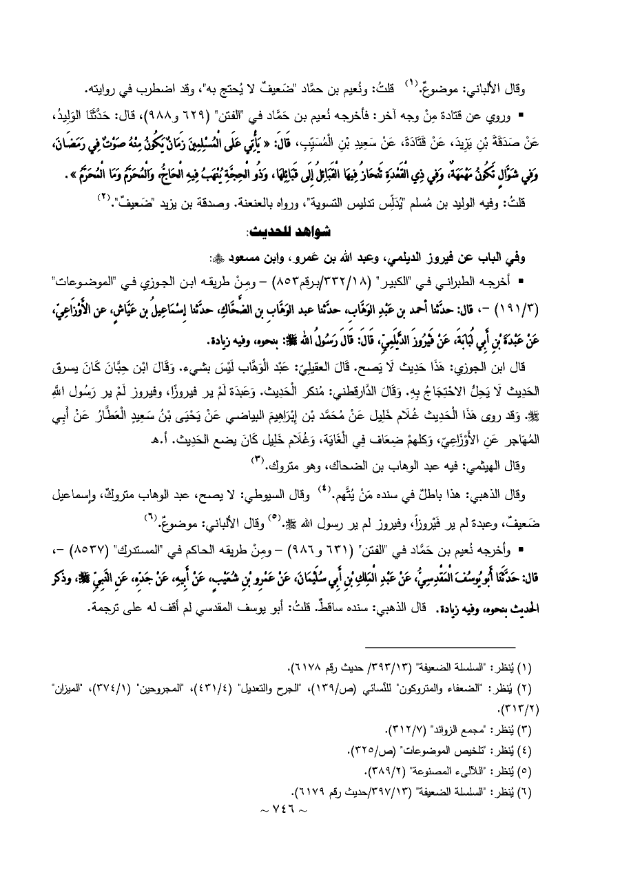 وقال الألباني: موضوعٌ. (¬١) قلتُ: ونُعيم بن حمَّاد "ضَعيفٌ لا يُحتج به"، وقد اضطرب في روايته.