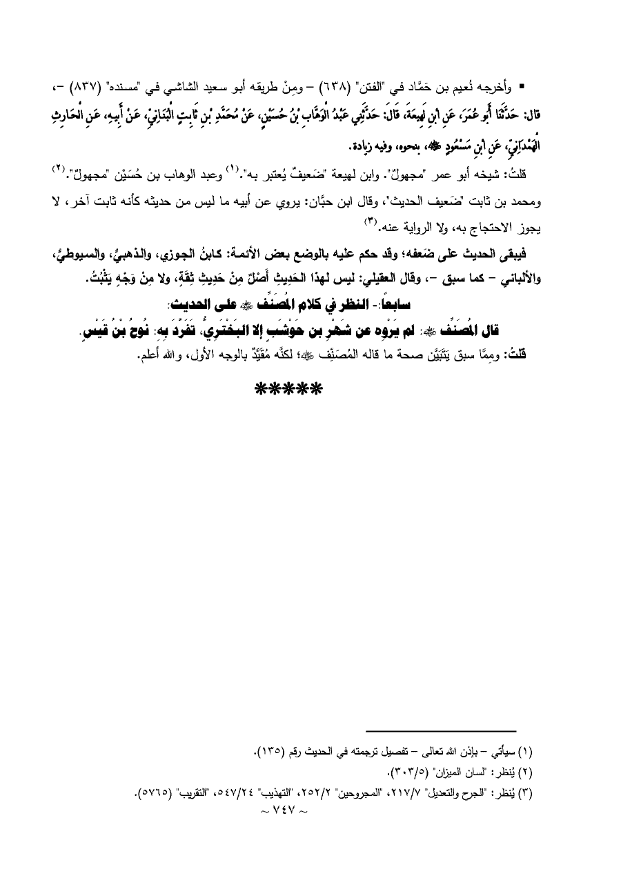 • وأخرجه نُعيم بن حَمَّاد في "الفتن" (٦٣٨) - ومِنْ طريقه أبو سعيد الشاشي في "مسنده" (٨٣٧) -، قال: حَدَّثَنَا أَبُو عُمَرَ، عَنِ ابْنِ لَهِيعَةَ، قَالَ: حَدَّثَنِي عَبْدُ الْوَهَّابِ بْنُ حُسَيْنٍ، عَنْ مُحَمَّدِ بْنِ ثَابِتٍ الْبُنَانِيِّ، عَنْ أَبِيهِ، عَنِ الْحَارِثِ الْهَمْدَانِيِّ، عَنِ ابْنِ مَسْعُودٍ - رضي الله عنه -، بنحوه، وفيه زيادة.