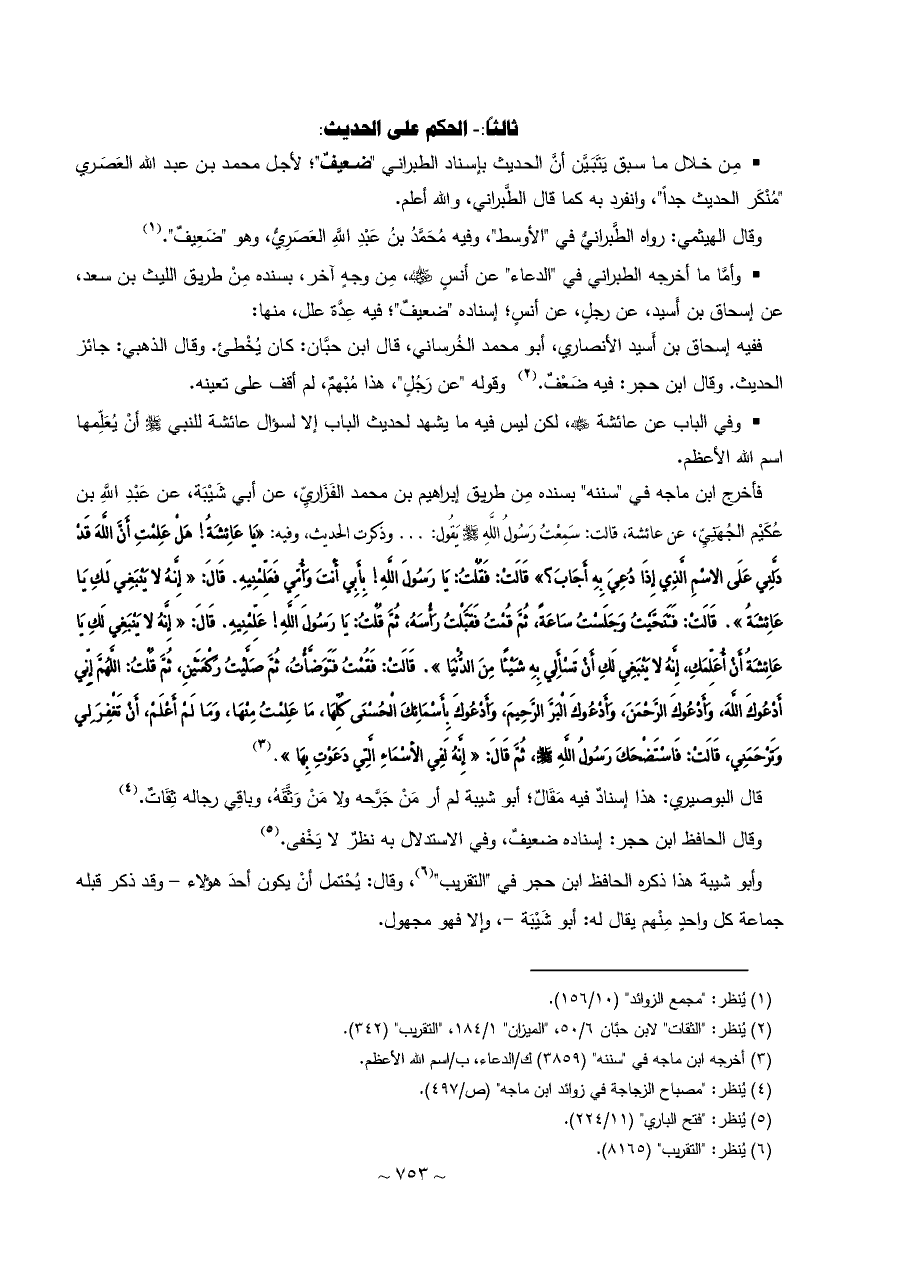 فأخرج ابن ماجه في "سننه" بسنده مِن طريق إبراهيم بن محمد الفَزَاريِّ، عن أبي شَيْبَة، عن عَبْدِ اللَّهِ بن عُكَيْم الجُهَنِيِّ، عن عائشة، قالت: سَمِعْتُ رَسُولُ اللَّهِ - صلى الله عليه وسلم - يَقُول: ... وذكرت الحديث، وفيه: «يَا عَائِشَةُ! هَلْ عَلِمْتِ أَنَّ اللَّهَ قَدْ دَلَّنِي عَلَى الاسْمِ الَّذِي إِذَا دُعِيَ بِهِ أَجَابَ؟» قَالَتْ: فَقُلْتُ: يَا رَسُولَ اللَّهِ! بِأَبِي أَنْتَ وَأُمِّي فَعَلِّمْنِيهِ. قَالَ: «إِنَّهُ لا يَنْبَغِي لَكِ يَا عَائِشَةُ». قَالَتْ: فَتَنَحَّيْتُ وَجَلَسْتُ سَاعَةً، ثُمَّ قُمْتُ فَقَبَّلْتُ رَأْسَهُ، ثُمَّ قُلْتُ: يَا رَسُولَ اللَّهِ! عَلِّمْنِيهِ. قَالَ: «إِنَّهُ لا يَنْبَغِي لَكِ يَا عَائِشَةُ أَنْ أُعَلِّمَكِ، إِنَّهُ لا يَنْبَغِي لَكِ أَنْ تَسْأَلِي بِهِ شَيْئًا مِنَ الدُّنْيَا». قَالَتْ: فَقُمْتُ فَتَوَضَّأْتُ، ثُمَّ صَلَّيْتُ رَكْعَتَيْنِ، ثُمَّ قُلْتُ: اللَّهُمَّ إِنِّي أَدْعُوكَ اللَّهَ، وَأَدْعُوكَ الرَّحْمَنَ، وَأَدْعُوكَ الْبَرَّ الرَّحِيمَ، وَأَدْعُوكَ بِأَسْمَائِكَ الْحُسْنَى كُلِّهَا، مَا عَلِمْتُ مِنْهَا، وَمَا لَمْ أَعْلَمْ، أَنْ تَغْفِرَ لِي وَتَرْحَمَنِي، قَالَتْ: فَاسْتَضْحَكَ رَسُولُ اللَّهِ - صلى الله عليه وسلم -، ثُمَّ قَالَ: «إِنَّهُ لَفِي الأسْمَاءِ الَّتِي دَعَوْتِ بِهَا». (¬٣)