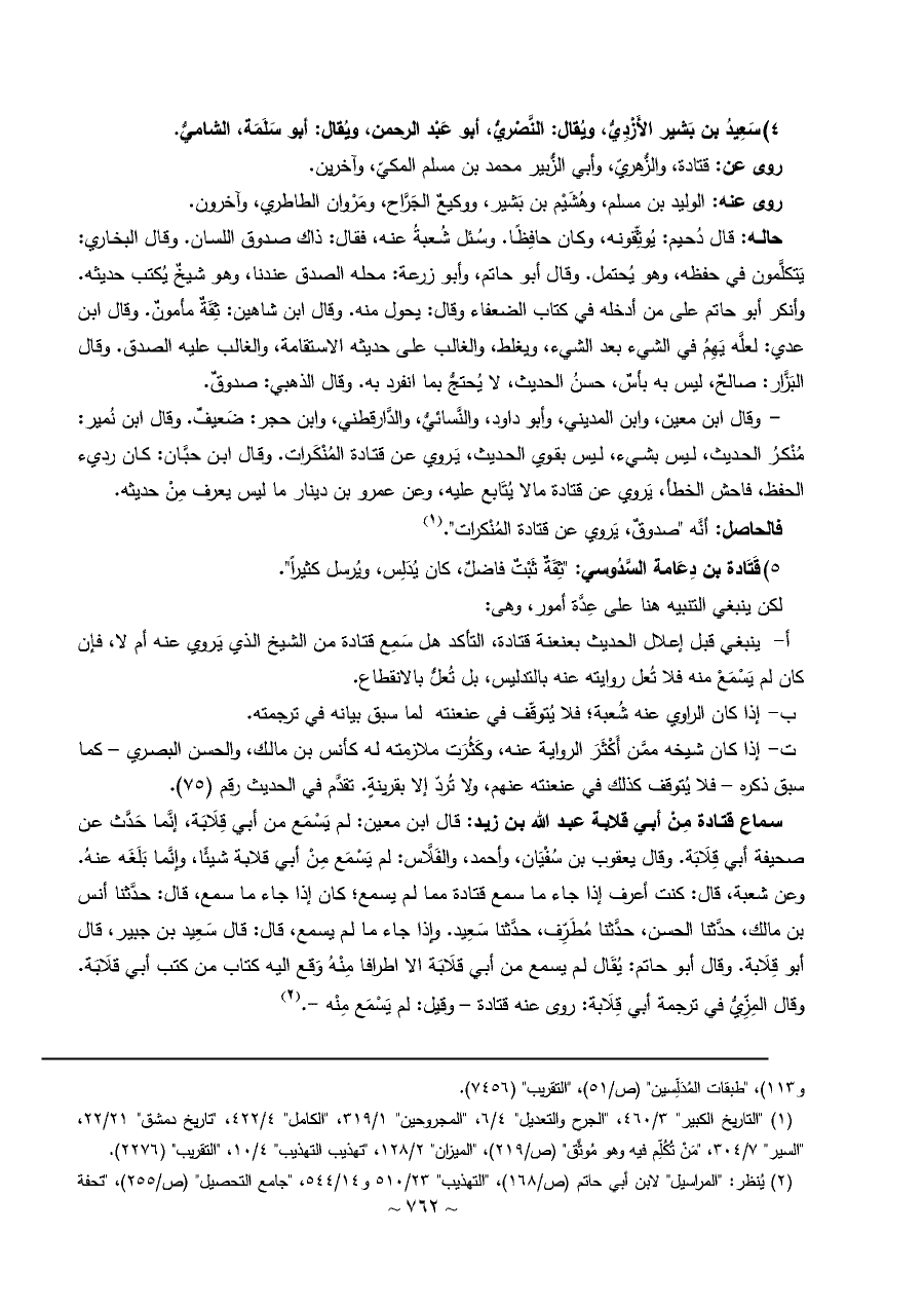 ٥) قَتَادة بن دِعَامة السَّدُوسي: "ثِقَةٌ ثَبْتٌ فاضلٌ، كان يُدَلِس، ويُرسل كثيراً".