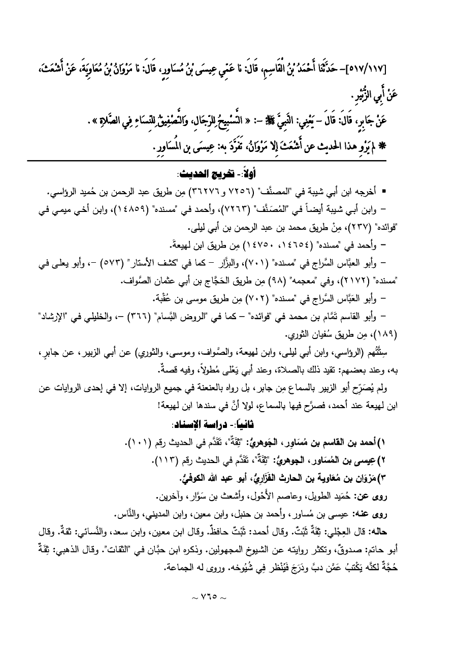 [١١٧/ ٥١٧]- حَدَّثَنَا أَحْمَدُ بْنُ الْقَاسِمِ، قَالَ: نا عَمِّي عِيسَى بْنُ مُسَاوِرٍ، قَالَ: نا مَرْوَانُ بْنُ مُعَاوِيَةَ، عَنْ أَشْعَثَ، عَنْ أَبِي الزُّبَيْرِ.