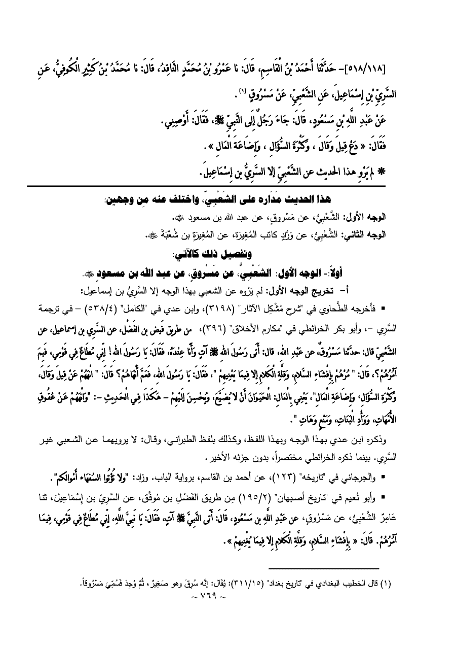 [١١٨/ ٥١٨]- حَدَّثَنَا أَحْمَدُ بْنُ الْقَاسِمِ، قَالَ: نا عَمْرُو بْنُ مُحَمَّدٍ النَّاقِدُ، قَالَ: نا مُحَمَّدُ بْنُ كَثِيرٍ الْكُوفِيُّ، عَنِ السَّرِيِّ بْنِ إِسْمَاعِيلَ، عَنِ الشَّعْبِيِّ، عَنْ مَسْرُوقٍ (¬١).