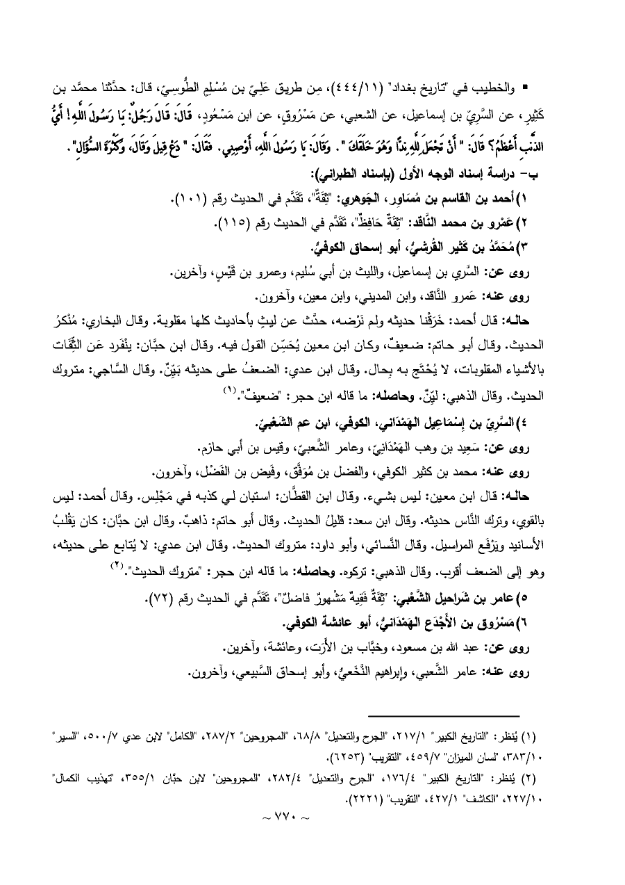 • والخطيب في "تاريخ بغداد" (١١/ ٤٤٤)، مِن طريق عَلِيّ بن مُسْلِمٍ الطُّوسِيّ، قال: حدَّثنا محمَّد بن كَثِيرٍ، عن السَّرِيِّ بن إسماعيل، عن الشعبي، عن مَسْرُوقٍ، عن ابن مَسْعُودٍ، قَالَ: قَالَ رَجُلٌ: يَا رَسُولَ اللَّهِ! أَيُّ الذَّنْبِ أَعْظَمُ؟ قَالَ: " أَنْ تَجْعَلَ لِلَّهِ نِدًّا وَهُوَ خَلَقَكَ ". وَقَالَ: يَا رَسُولَ اللَّهِ، أَوْصِنِي. فَقَالَ: " دَعْ قِيلَ وَقَالَ، وَكَثْرَةَ السُّؤَالِ".