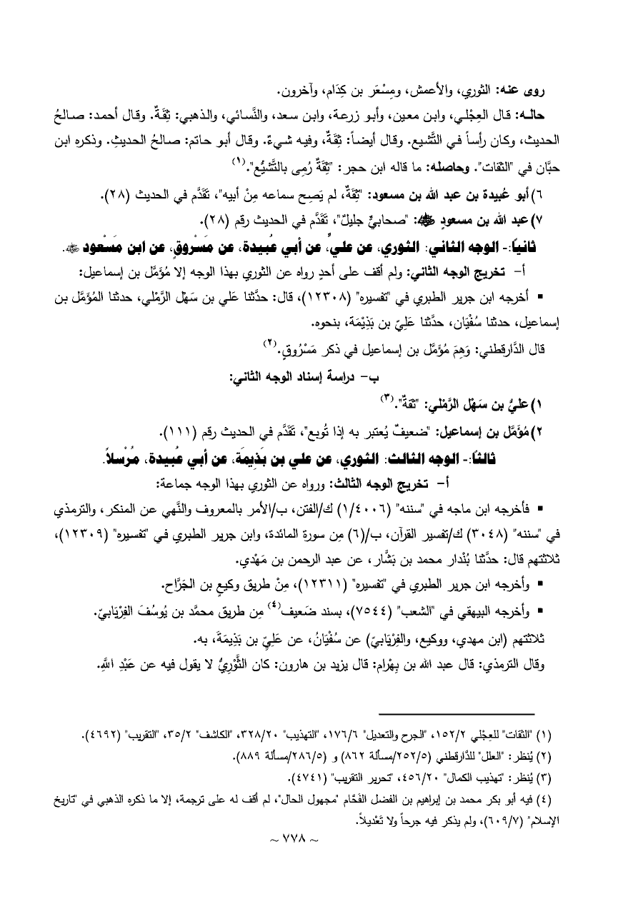ثانياً: - الوجه الثاني: الثوري، عن عليٍّ، عن أبي عُبيدة، عن مَسْروقٍ، عن ابن مَسْعود - رضي الله عنه -.