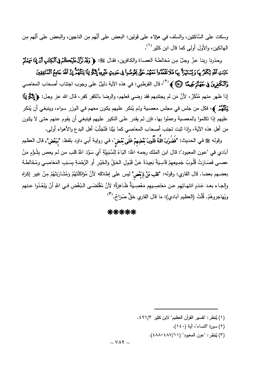 وقوله - صلى الله عليه وسلم - في الحديث: "فَضَرَبَ اللَّهُ قُلُوبَ بَعْضِهِمْ عَلَى بَعْضٍ"، في رواية أبي داود بلفظ: "بِبَعْض"، قال العظيم آبادي في "عون المعبود": قال ابن الملك رحمه اللَّهُ: البَاءُ لِلسَّبَبِيَّةِ أي سَوَّدَ اللَّهُ قلب من لم يعص بِشُؤْمِ مَنْ عصى فَصَارَتْ قُلُوبُ جَمِيعِهِمْ قَاسِيَةً بَعِيدَةً عَنْ قَبُولِ الحَقِّ والخَيْرِ أو الرَّحْمَةِ بِسَبَبِ المَعَاصِي ومُخَالطة بعضهم بعضا. قال القاري: وقوله: "قلب مَنْ لم يَعْصِ" ليس على إطلاقه لأنَّ مُؤَاكَلَتَهُمْ وَمُشَارَبَتَهُمْ مِنْ غير إكراه وإلجاء بعد عَدَمِ انتهائِهِم عن مَعَاصِيهِم مَعْصِيَةٌ ظَاهِرَةٌ؛ لأنَّ مُقْتَضَى البُغْضِ في اللَّهِ أنْ يَبْعُدُوا عنهم ويُهاجروهُمُ. قُلْتُ (العظيم آبادي): ما قال القاري حَقٌّ صُرَاحٌ. (¬٣)