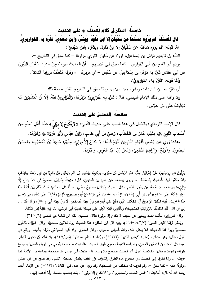 قال الإمام الترمذي: والعَمَلُ في هذا الباب على حديثِ النَّبِيِّ: «لا نِكَاحَ إلا بِوَلِيٍّ» عِنْدَ أَهْلِ العِلْمِ مِنْ أَصْحَابِ النَّبِيِّ - صلى الله عليه وسلم -، مِنْهُمْ: عُمَرُ بن الخَطَّابِ، وَعَلِيُّ بْنُ أَبِي طَالِبٍ، وَابْنُ عَبَّاسٍ وَأَبُو هُرَيْرَةَ - رضي الله عنهم - وَغَيْرُهُمْ.