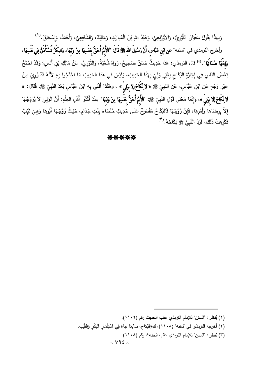 وأخرج الترمذي في "سننه" عن ابْنِ عَبَّاسٍ، أَنَّ رَسُولَ اللهِ - صلى الله عليه وسلم - قَالَ: "الأَيِّمُ أَحَقُّ بِنَفْسِهَا مِنْ وَلِيِّهَا، وَالبِكْرُ تُسْتَأْذَنُ فِي نَفْسِهَا، وَإِذْنُهَا صُمَاتُهَا". (¬٢) قال الترمذي: هَذَا حَدِيثٌ حَسَنٌ صَحِيحٌ، رَوَاهُ شُعْبَةُ، وَالثَّوْرِيُّ، عَنْ مَالِكِ بْنِ أَنَسٍ؛ وَقَدْ احْتَجَّ بَعْضُ النَّاسِ فِي إِجَازَةِ النِّكَاحِ بِغَيْرِ وَلِيٍّ بِهَذَا الحَدِيثِ، وَلَيْسَ في هَذَا الحَدِيثِ مَا احْتَجُّوا بِهِ لأَنَّهُ قَدْ رُوِيَ مِنْ غَيْرِ وَجْهٍ عَنِ ابْنِ عَبَّاسٍ، عَنِ النَّبِيِّ - صلى الله عليه وسلم - «لا نِكَاحَ إلا بِوَلِيٍّ»، وَهَكَذَا أَفْتَى بِهِ ابْنُ عَبَّاسٍ بَعْدَ النَّبِيِّ - صلى الله عليه وسلم -، فَقَالَ: «لا نِكَاحَ إلا بِوَلِيٍّ»، وَإِنَّمَا مَعْنَى قَوْلِ النَّبِيِّ - صلى الله عليه وسلم -: "الأَيِّمُ أَحَقُّ بِنَفْسِهَا مِنْ وَلِيِّهَا" عِنْدَ أَكْثَرِ أَهْلِ العِلْمِ: أَنَّ الوَلِيَّ لَا يُزَوِّجُهَا إِلَاّ بِرِضَاهَا وَأَمْرِهَا، فَإِنْ زَوَّجَهَا فَالنِّكَاحُ مَفْسُوخٌ عَلَى حَدِيثِ خَنْسَاءَ بِنْتِ خِذَامٍ، حَيْثُ زَوَّجَهَا أَبُوهَا وَهِيَ ثَيِّبٌ فَكَرِهَتْ ذَلِكَ، فَرَدَّ النَّبِيُّ - صلى الله عليه وسلم - نِكَاحَهُ. (¬٣)