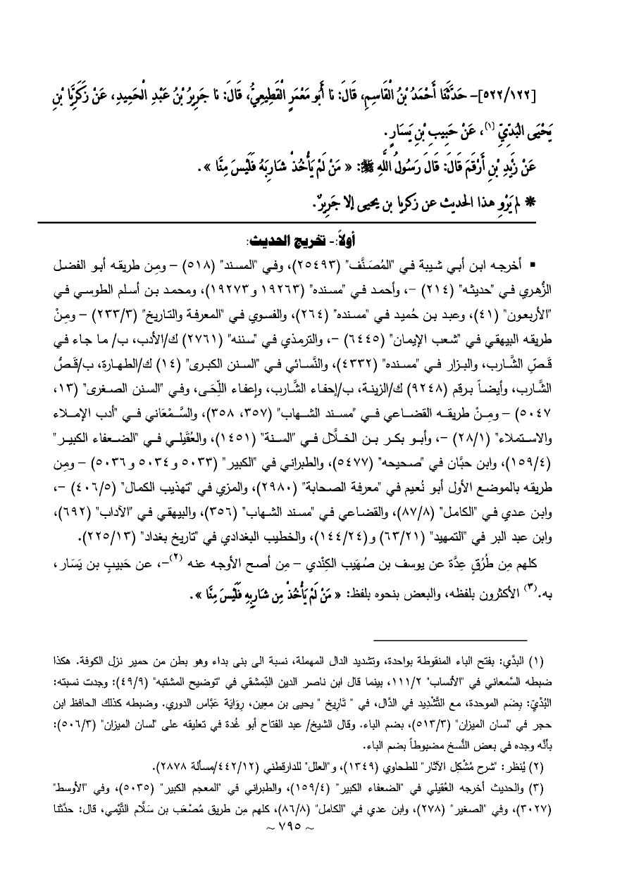 [١٢٢/ ٥٢٢]- حَدَّثَنَا أَحْمَدُ بْنُ الْقَاسِمِ، قَالَ: نا أَبُو مَعْمَرٍ الْقَطِيعِيُّ، قَالَ: نا جَرِيرُ بْنُ عَبْدِ الْحَمِيدِ، عَنْ زَكَرِيَّا بْنِ يَحْيَى البُدِّيِّ (¬١)، عَنْ حَبِيبِ بْنِ يَسَارٍ.