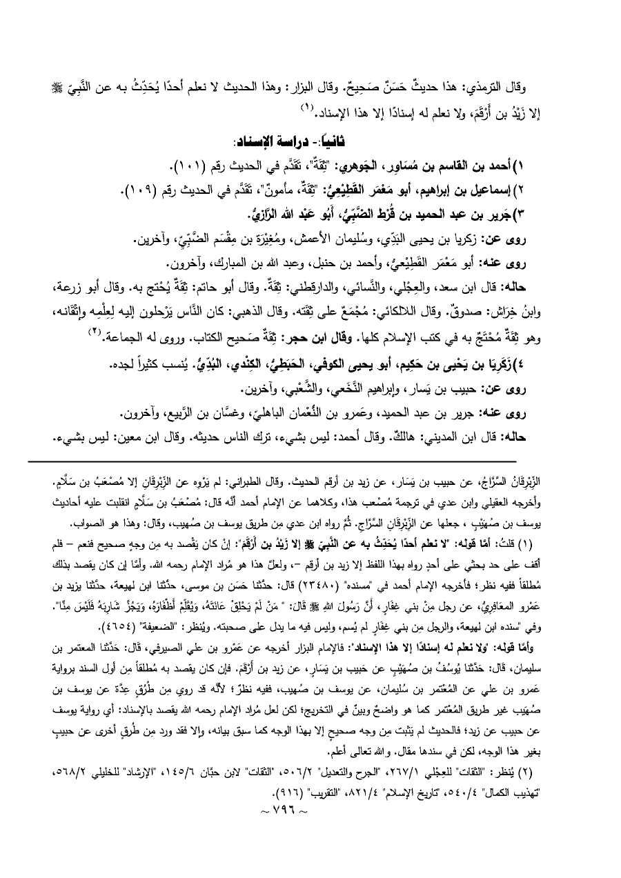 وقال الترمذي: هذا حديثٌ حَسَنٌ صَحِيحٌ. وقال البزار: وهذا الحديث لا نعلم أحدًا يُحَدِّثُ به عن النَّبِيّ - صلى الله عليه وسلم - إلا زَيْدُ بن أَرْقَمَ، ولا نعلم له إسنادًا إلا هذا الإسناد. (¬١)