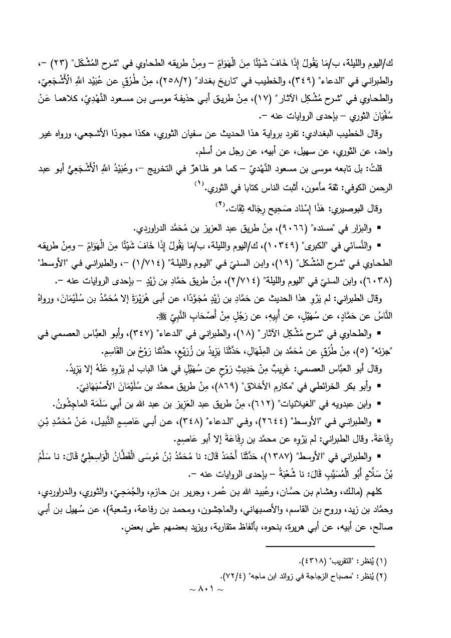 ك/اليوم والليلة، ب/مَا يَقُولُ إِذَا خَافَ شَيْئًا مِنَ الْهَوَامِّ - ومِنْ طريقه الطحاوي في "شرح المُشْكَل" (٢٣) -، والطبراني في "الدعاء" (٣٤٩)، والخطيب في "تاريخ بغداد" (٢/ ٢٥٨)، مِنْ طُرُقٍ عن عُبَيْد اللَّهِ الْأَشْجَعِيّ، والطحاوي في "شرح مُشْكِل الآثار" (١٧)، مِنْ طريق أبي حذيفة موسى بن مسعود النَّهْدِيّ، كلاهما عَنْ سُفْيَانَ الثوري - بإحدى الروايات عنه -.