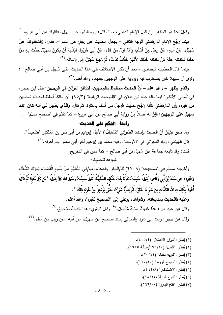 بينما رجَّح الإمام الدارقطني الوجه الثاني - بجعل الحديث عن رجلٍ عن أسلم -، فقال: وَالْمَحْفُوظُ: عَنْ سُهَيْلٍ، عَنْ أَبِيهِ، عَنْ رَجُلٍ مِنْ أَسْلَمَ؛ وَأَمَّا قَوْلُ مَنْ قَالَ، عَنْ أَبِي هُرَيْرَةَ، فَيُشْبِهُ أَنْ يَكُونَ سُهَيْلٌ حَدَّثَ بِهِ مَرَّةً هَكَذَا فَحَفِظَهُ عَنْهُ مَنْ حَفِظَهُ كَذَلِكَ لِأَنَّهُمْ حُفَّاظٌ ثِقَاتٌ، ثُمَّ رَجَعَ سُهَيْلٌ إِلَى إِرْسَالِهِ. (¬٢)