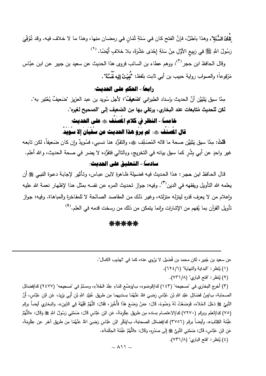 (¬٣) أخرج البخاري في "صحيحه" (١٤٣) ك/الوضوء، ب/وَضْعِ المَاءِ عِنْدَ الخَلَاءِ، ومسلمٌ في "صحيحه" (٢٤٧٧) ك/فضائل الصحابة، ب/مِنْ فَضَائِلِ عَبْدِ اللهِ بْنِ عَبَّاسٍ رَضِيَ اللهُ عَنْهُمَا بسنديهما مِن طريق عُبَيْدِ اللَّهِ بْنِ أَبِي يَزِيدَ، عَنِ ابْنِ عَبَّاسٍ، أَنَّ النَّبِيَّ - صلى الله عليه وسلم - دَخَلَ الخَلَاءَ، فَوَضَعْتُ لَهُ وَضُوءً، قَالَ: «مَنْ وَضَعَ هَذَا فَأُخْبِرَ، فَقَالَ: اللَّهُمَّ فَقِّهْهُ فِي الدِّينِ». والبخاري أيضاً برقم (٧٥) ك/العلم وبرقم (٧٢٧٠) ك/الاعتصام بسنده مِن طريق عِكْرِمَةَ، عَنِ ابْنِ عَبَّاسٍ قَالَ: ضَمَّنِي رَسُولُ اللَّهِ - صلى الله عليه وسلم - وَقَالَ: «اللَّهُمَّ عَلِّمْهُ الكِتَابَ». وأيضاً برقم (٣٧٥٦) ك/فضائل الصحابة، ب/ذِكْرِ ابْنِ عَبَّاسٍ رَضِيَ اللَّهُ عَنْهُمَا مِن طريق آخر عن عِكْرِمَةَ، عَنِ ابْنِ عَبَّاسٍ، قَالَ: ضَمَّنِي النَّبِيُّ - صلى الله عليه وسلم - إِلَى صَدْرِهِ، وَقَالَ: «اللَّهُمَّ عَلِّمْهُ الحِكْمَةَ».