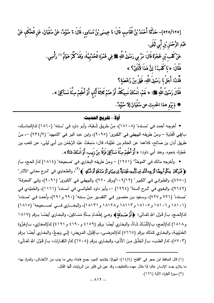 • وأخرجه مالك في "الموطأ" (١٢٥١) - ومِنْ طريقه البخاري في "صحيحه" (١٨١٤) ك/ الحج، ب/ {فَمَنْ كَانَ مِنْكُمْ مَرِيضًا أَوْ بِهِ أَذًى مِنْ رَأْسِهِ فَفِدْيَةٌ مِنْ صِيَامٍ أَوْ صَدَقَةٍ أَوْ نُسُكٍ} (¬٢)، والطحاوي في "شرح معاني الآثار" (٤٧٥٠)، والطبراني في "الكبير" (١٩/ ١٠٩/برقم ٢٢٠)، والبيهقي في "الكبرى" (٩٠٩١)، وفي "المعرفة" (٩٦٤٢)، والبغوي في "شرح السنة" (١٩٩٤) -، وأبو داود الطيالسي في "مسنده" (١١٦١)، والحُمَيْدي في "مسنده" (٧٢٦ و ٧٢٧)، وسعيد بن منصور في "التفسير مِنْ سننه" (٢٩٠ و ٢٩١)، وأحمد في "مسنده" (١٨١٠١ و ١٨١٠٦ و ١٨١٠٧ و ١٨١١٣ و ١٨١٢٨ و ١٨١٣١)، والبخاري في "صحيحه" (١٨١٥) ك/الحج، ب/ قَوْلِ اللَّهِ تَعَالَى: {أَوْ صَدَقَةٍ} وَهِيَ إِطْعَامُ سِتَّةِ مَسَاكِينَ، والبخاري أيضًا برقم (١٨١٧ و ١٨١٨) ك/الحج، ب/النُّسْكُ شَاةٌ، والبخاري أيضًا برقم (٤١٥٩ و ٤١٩٠ و ٤١٩١) ك/المغازي، ب/غَزْوَة الحُدَيْبِيَةِ، والبخاري كذلك برقم (٥٦٦٥) ك/المرضى، ب/قَوْلِ المَرِيضِ: إِنِّي وَجِعٌ، والبخاري أيضًا برقم (٥٧٠٣)، ك/ الطب، ب/ الحَلْق مِنَ الأَذَى، والبخاري برقم (٦٧٠٨) ك/ الكفارات، ب/ قَوْلِ اللَّهِ تَعَالَى: ...