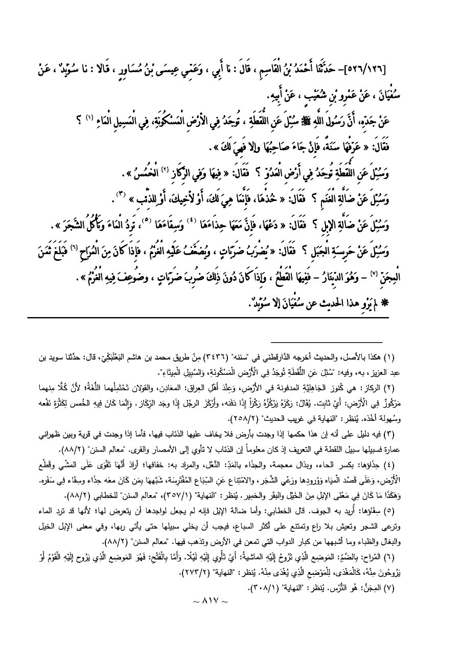 (¬١) هكذا بالأصل، والحديث أخرجه الدَّارقطني في "سننه" (٣٤٣٦) مِنْ طريق محمد بن هاشم البَعْلَبَكِّيّ، قال: حدَّثنا سويد بن عبد العزيز، به، وفيه: "سُئِلَ عَنِ اللُّقَطَةِ تُوجَدُ فِي الْأَرْضِ الْمَسْكُونَةِ، وَالسَّبِيلِ الْمِيتَاءِ".