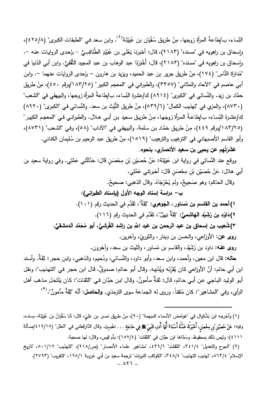 (¬١) وأخرجه ابن بَشْكوال في "غوامض الأسماء المبهمة" (٢٠)، مِنْ طريق نصر بن عَلِيٍّ، قال: ثنا سُفْيَانُ بن عُيَيْنَة، بسنده، وفيه: عَنْ حُصَيْنِ بْنِ مِحْصَنٍ، أَخْبَرَتْهُ عَمَّتُهُ أَسْمَاءُ أَنَّهَا أَتَتِ النَّبِيِّ - صلى الله عليه وسلم - فِي حَاجَةٍ ... الحديث. وقال الدَّارقطني في "العلل" (١٥/ ٤١٩/مسألة ٤١١١): وليس ذلك بمحفوظ. وسَمَّاها ابن حبَّان في "الثقات" (٤/ ١٥٧): بأم قيس، وقال: لها صحبة.