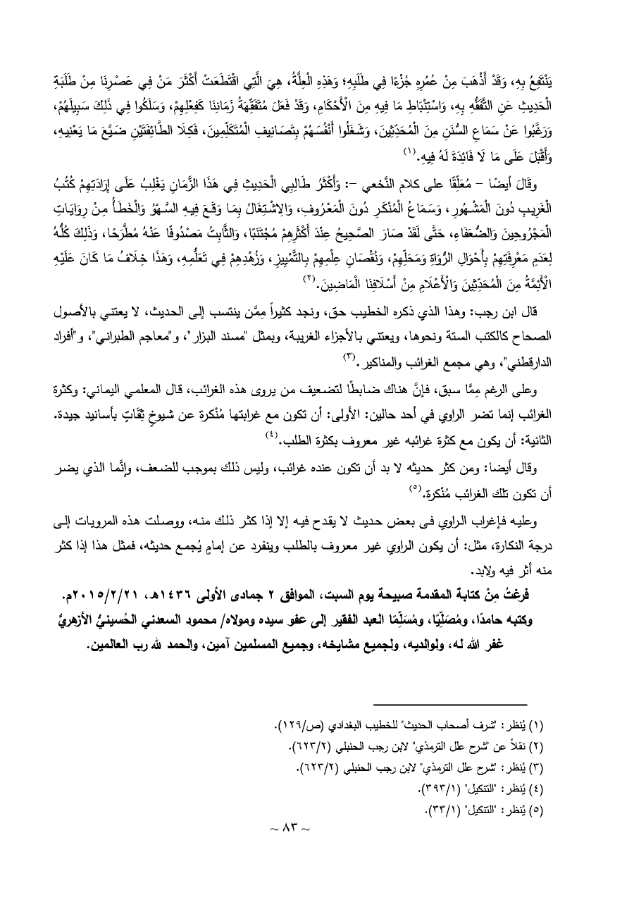 قال ابن رجب: وهذا الذي ذكره الخطيب حق، ونجد كثيراً مِمَّن ينتسب إلى الحديث، لا يعتني بالأصول الصحاح كالكتب الستة ونحوها، ويعتني بالأجزاء الغريبة، وبمثل "مسند البزار"، و"معاجم الطبراني"، و"أفراد الدارقطني"، وهي مجمع الغرائب والمناكير. (¬٣)