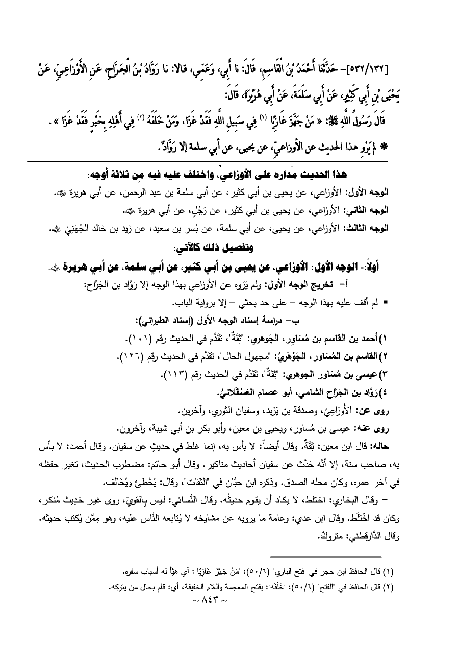 أ تخريج الوجه الأول: ولم يَرْوه عن الأوزاعي بهذا الوجه إلا رَوَّاد بن الجَرَّاح: