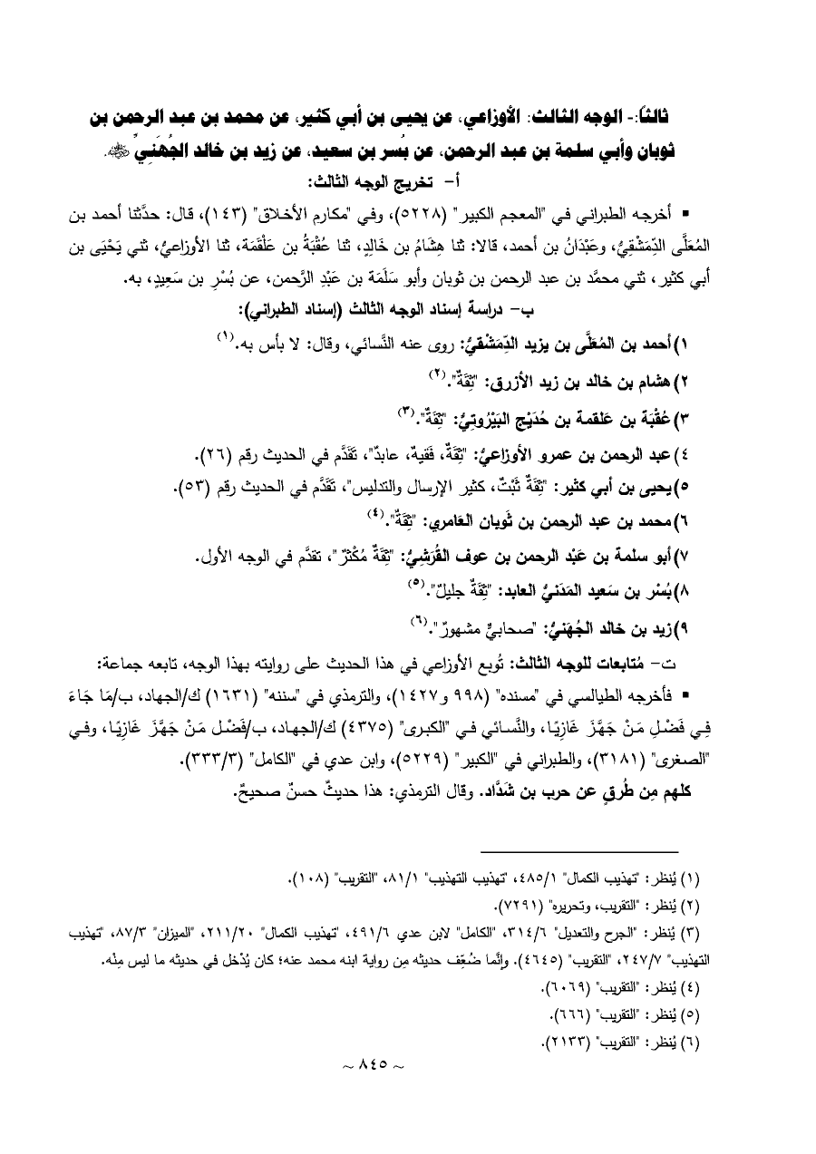 ت مُتابعات للوجه الثالث: تُوبع الأوزاعي في هذا الحديث على روايته بهذا الوجه، تابعه جماعة: