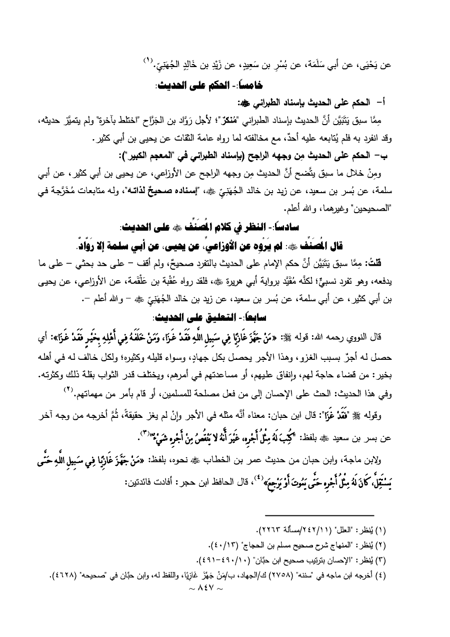 ومِنْ خلال ما سبق يتَّضح أنَّ الحديث مِن وجهه الراجح عن الأوزاعي، عن يحيى بن أبي كثير، عن أبي سلمة، عن بُسر بن سعيد، عن زيد بن خالد الجُهَنِيِّ - رضي الله عنه -، "إسناده صحيحٌ لذاته"، وله متابعات مُخَرَّجة في "الصحيحين" وغيرهما، والله أعلم.