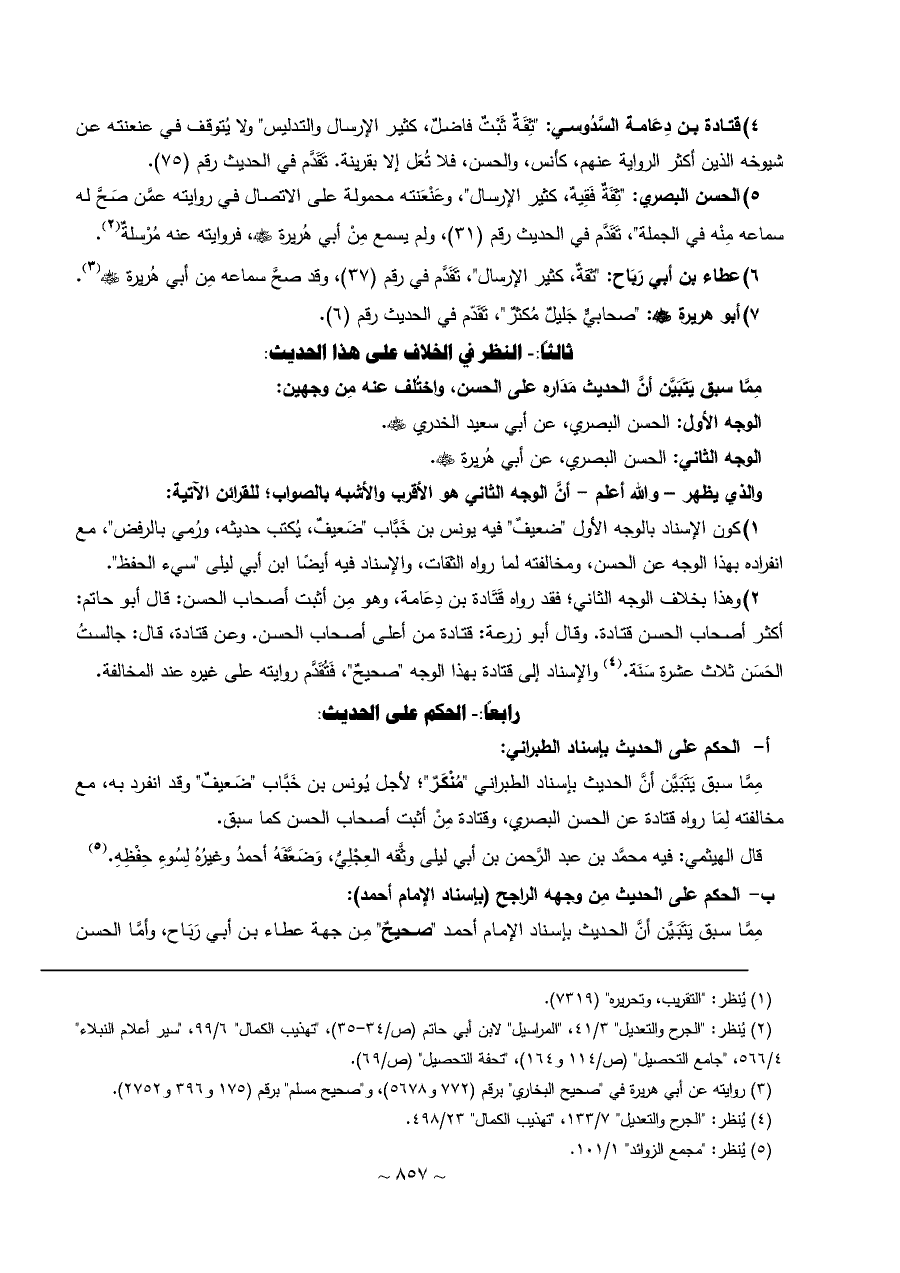 ٢) وهذا بخلاف الوجه الثاني؛ فقد رواه قَتَادة بن دِعَامة، وهو مِن أثبت أصحاب الحسن: قال أبو حاتم: أكثر أصحاب الحسن قتادة. وقال أبو زرعة: قتادة من أعلى أصحاب الحسن. وعن قتادة، قال: جالستُ الحَسَن ثلاث عشرة سَنَة. (¬٣) والإسناد إلى قتادة بهذا الوجه "صحيحٌ"، فَتُقَدَّم روايته على غيره عند المخالفة.
