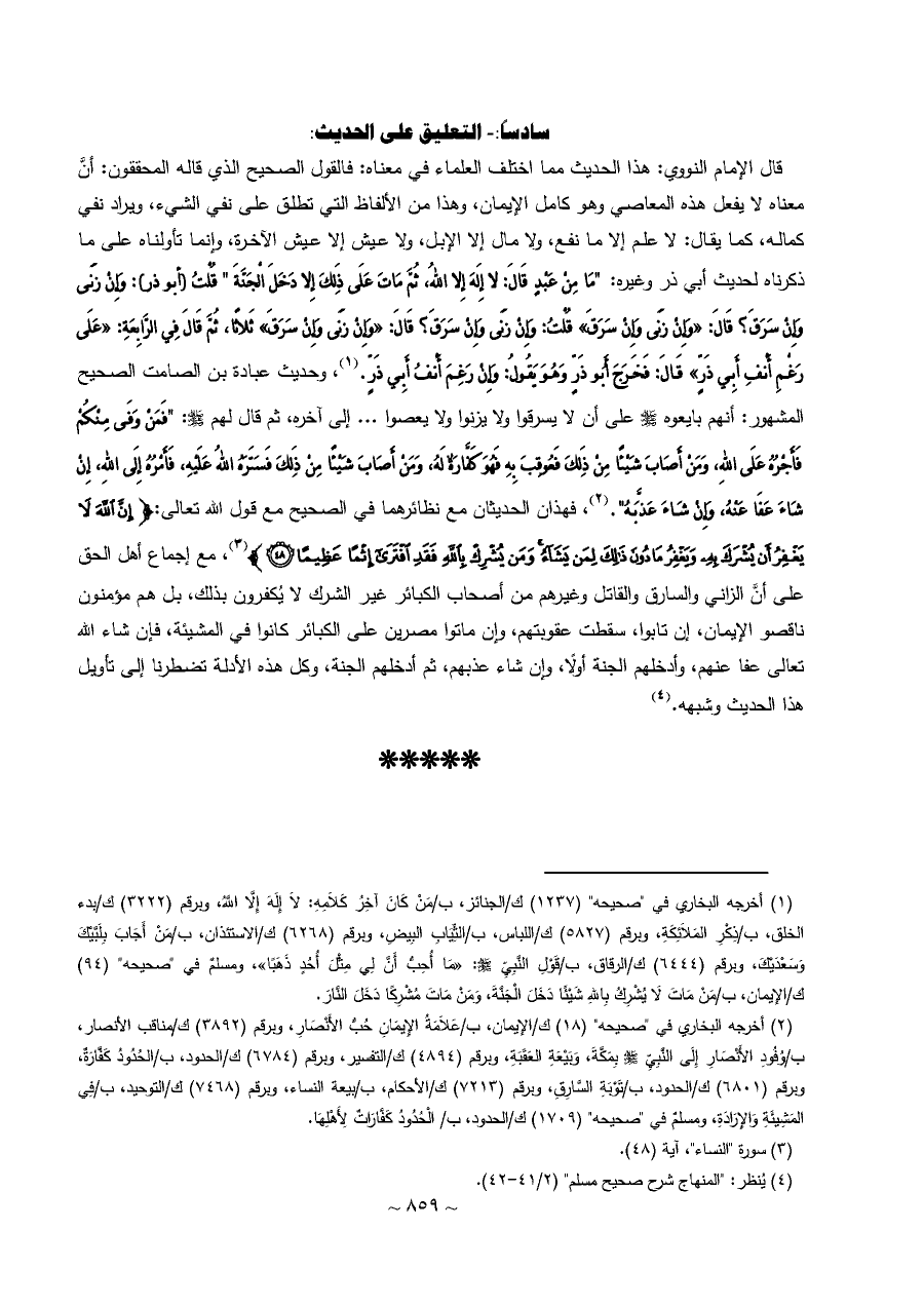 إلى آخره، ثم قال لهم - صلى الله عليه وسلم -: "فَمَنْ وَفَى مِنْكُمْ فَأَجْرُهُ عَلَى اللهِ، وَمَنْ أَصَابَ شَيْئًا مِنْ ذَلِكَ فَعُوقِبَ بِهِ فَهُوَ كَفَّارَةٌ لَهُ، وَمَنْ أَصَابَ شَيْئًا مِنْ ذَلِكَ فَسَتَرَهُ اللهُ عَلَيْهِ، فَأَمْرُهُ إِلَى اللهِ، إِنْ شَاءَ عَفَا عَنْهُ، وَإِنْ شَاءَ عَذَّبَهُ". (¬٢)، فهذان الحديثان مع نظائرهما في الصحيح مع قول الله تعالى: {إِنَّ اللَّهَ لَا يَغْفِرُ أَنْ يُشْرَكَ بِهِ وَيَغْفِرُ مَا دُونَ ذَلِكَ لِمَنْ يَشَاءُ وَمَنْ يُشْرِكْ بِاللَّهِ فَقَدِ افْتَرَى إِثْمًا عَظِيمًا (٤٨)} (¬٣)، مع إجماع أهل الحق على أنَّ الزاني والسارق والقاتل وغيرهم من أصحاب الكبائر غير الشرك لا يُكفرون بذلك، بل هم مؤمنون ناقصو الإيمان، إن تابوا، سقطت عقوبتهم، وإن ماتوا مصرين على الكبائر كانوا في المشيئة، فإن شاء الله تعالى عفا عنهم، وأدخلهم الجنة أولًا، وإن شاء عذبهم، ثم أدخلهم الجنة، وكل هذه الأدلة تضطرنا إلى تأويل هذا الحديث وشبهه. (¬٤)