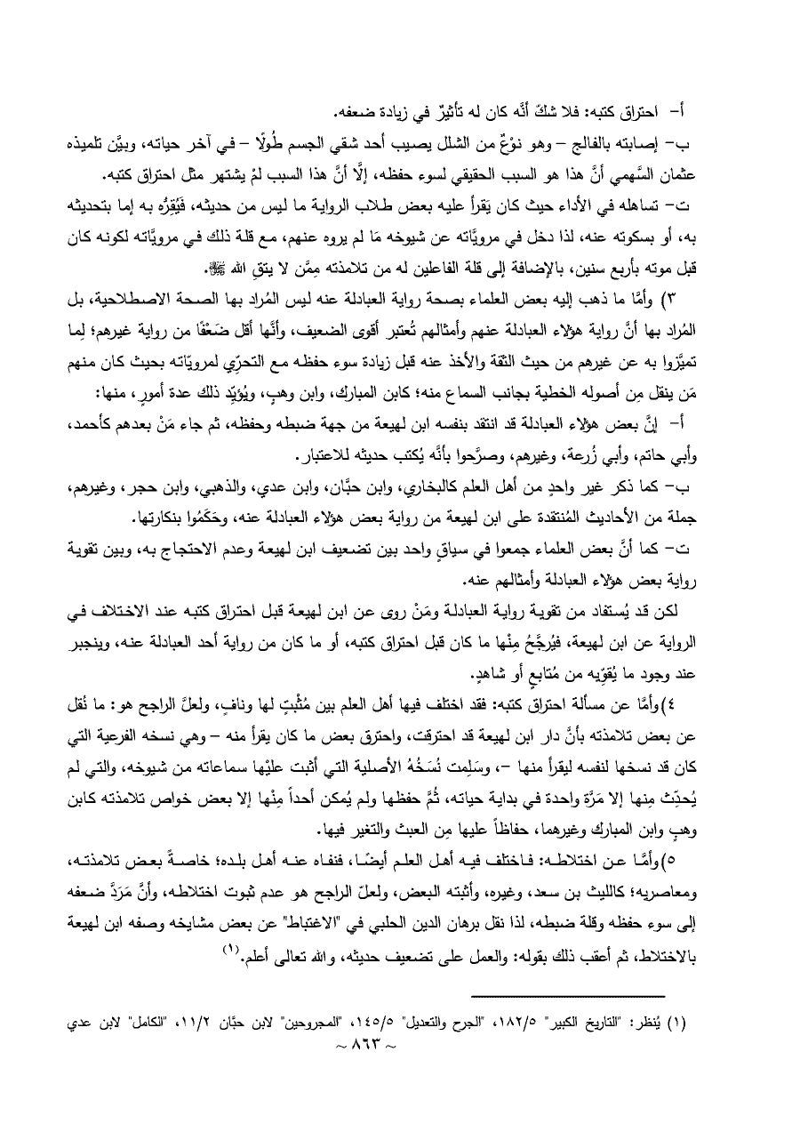 أ إنَّ بعض هؤلاء العبادلة قد انتقد بنفسه ابن لهيعة من جهة ضبطه وحفظه, ثم جاء مَنْ بعدهم كأحمد, وأبي حاتم, وأبي زُرعة, وغيرهم, وصرَّحوا بأنَّه يُكتب حديثه للاعتبار.