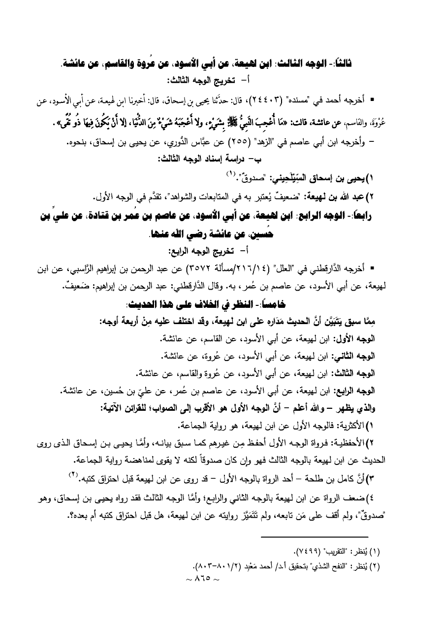 ٤) ضعف الرواة عن ابن لهيعة بالوجه الثاني والرابع؛ وأمَّا الوجه الثالث فقد رواه يحيى بن إسحاق، وهو "صدوقٌ"، ولم أقف على مَن تابعه، ولم تَتَمَيَّز روايته عن ابن لهيعة، هل قبل احتراق كتبه أم بعده؟.