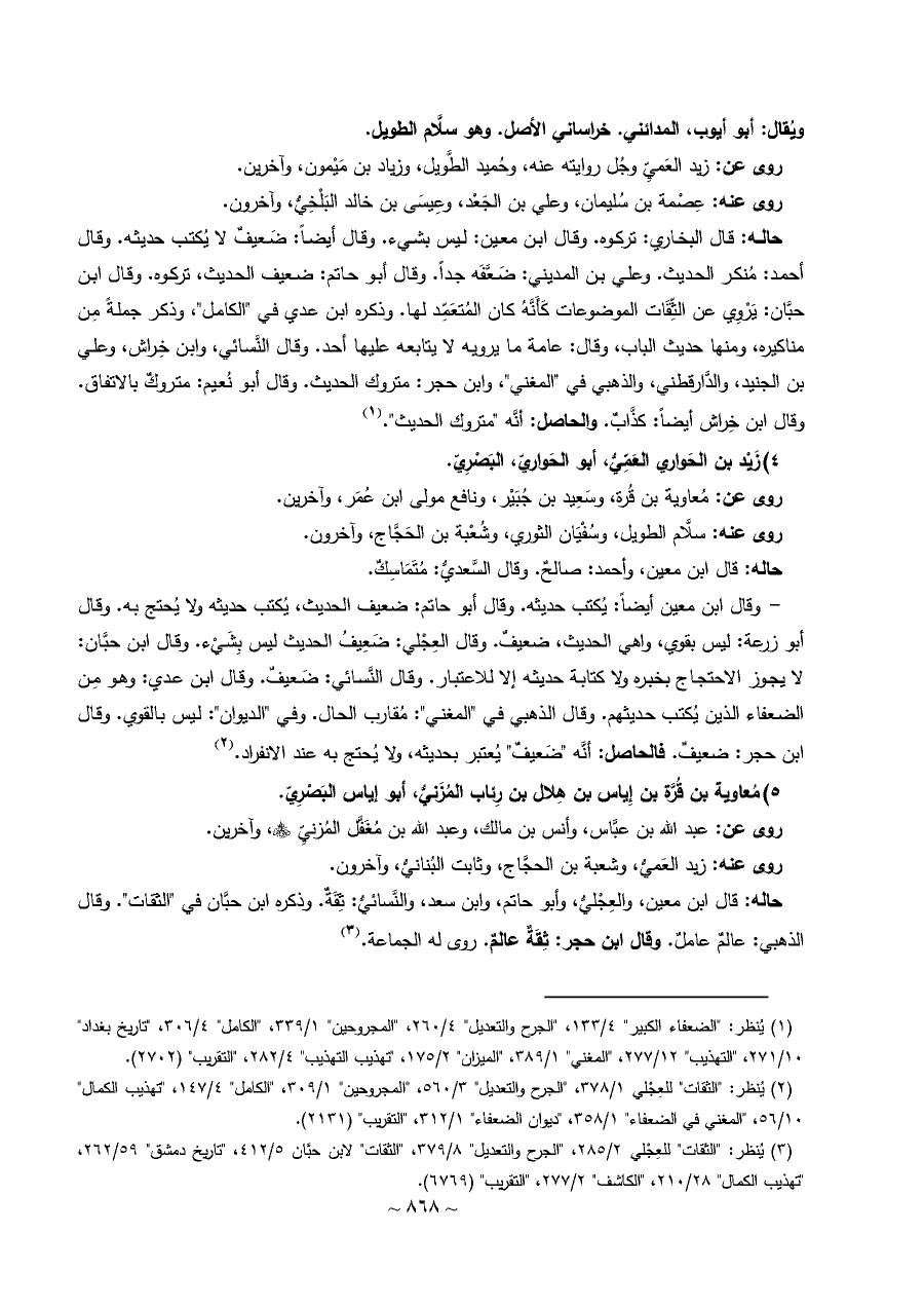 - وقال ابن معين أيضاً: يُكتب حديثه. وقال أبو حاتم: ضعيف الحديث، يُكتب حديثه ولا يُحتج به. وقال أبو زرعة: ليس بقوي، واهي الحديث، ضعيفٌ. وقال العِجْلي: ضَعِيفُ الحديث ليس بِشَيْء. وقال ابن حبَّان: لا يجوز الاحتجاج بخبره ولا كتابة حديثه إلا للاعتبار. وقال النَّسائي: ضَعيفٌ. وقال ابن عدي: وهو مِن الضعفاء الذين يُكتب حديثهم. وقال الذهبي في "المغني": مُقارب الحال. وفي "الديوان": ليس بالقوي. وقال ابن حجر: ضعيفٌ. فالحاصل: أنَّه "ضَعيفٌ" يُعتبر بحديثه، ولا يُحتج به عند الانفراد. (¬٢)