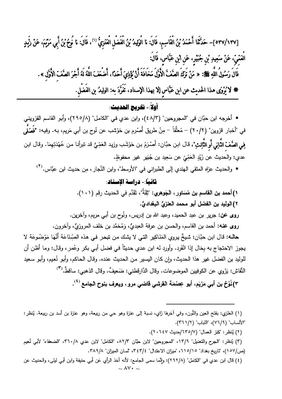 [١٣٧/ ٥٣٧]- حَدَّثَنَا أَحْمَدُ بْنُ الْقَاسِمِ، قَالَ: نا الْوَلِيدُ بْنُ الْفَضْلِ الْعَنَزِيُّ (¬١)، قَالَ: نا نُوحُ بْنُ أَبِي مَرْيَمَ، عَنْ زَيْدٍ الْعَمِّيِّ، عَنْ سَعِيدِ بْنِ جُبَيْرٍ، عَنِ ابْنِ عَبَّاسٍ، قَالَ: