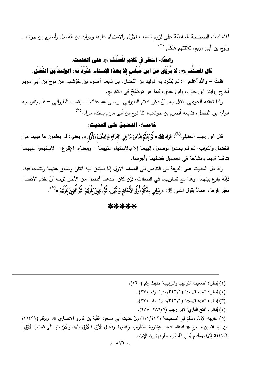 للأحاديث الصحيحة الحاضَّة على لزوم الصف الأول والاستهام عليه، والوليد بن الفضل وأصرم بن حوشب ونوح بن أبى مريم، ثلاثتهم هلكى. (¬١)
