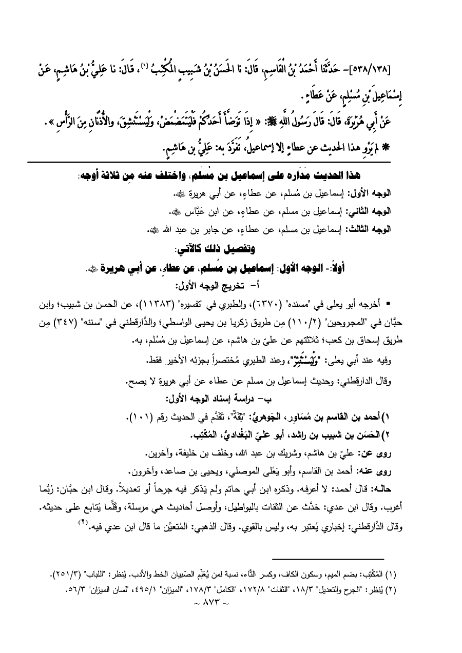 [١٣٨/ ٥٣٨]- حَدَّثَنَا أَحْمَدُ بْنُ الْقَاسِمِ، قَالَ: نا الحَسَنُ بْنُ شَبِيبٍ المُكْتِبُ (¬١)، قَالَ: نا عَلِيُّ بْنُ هَاشِمٍ، عَنْ إِسْمَاعِيلَ بْنِ مُسْلِمٍ، عَنْ عَطَاءٍ.