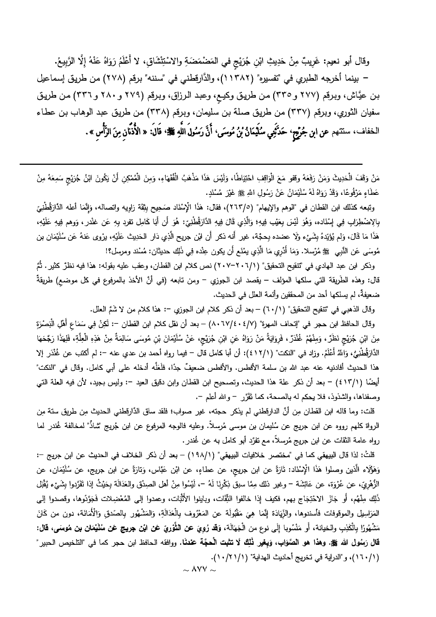 - بينما أخرجه الطبري في "تفسيره" (١١٣٨٢)، والدَّارقطني في "سننه" برقم (٢٧٨) من طريق إسماعيل بن عيَّاش، وبرقم (٢٧٧ و ٣٣٥) من طريق وكيعٍ، وعبد الرزاق، وبرقم (٢٧٩ و ٢٨٠ و ٣٣٦) من طريق سفيان الثوري، وبرقم (٣٣٧) من طريق صلة بن سليمان، وبرقم (٣٣٨) من طريق عبد الوهاب بن عطاء الخفاف، ستتهم عن ابن جُرَيْجٍ, حَدَّثَنِي سُلَيْمَانُ بْنُ مُوسَى, أَنَّ رَسُولَ اللَّهِ - صلى الله عليه وسلم - , قَالَ: «الأُذُنَانِ مِنَ الرَّأْسِ».