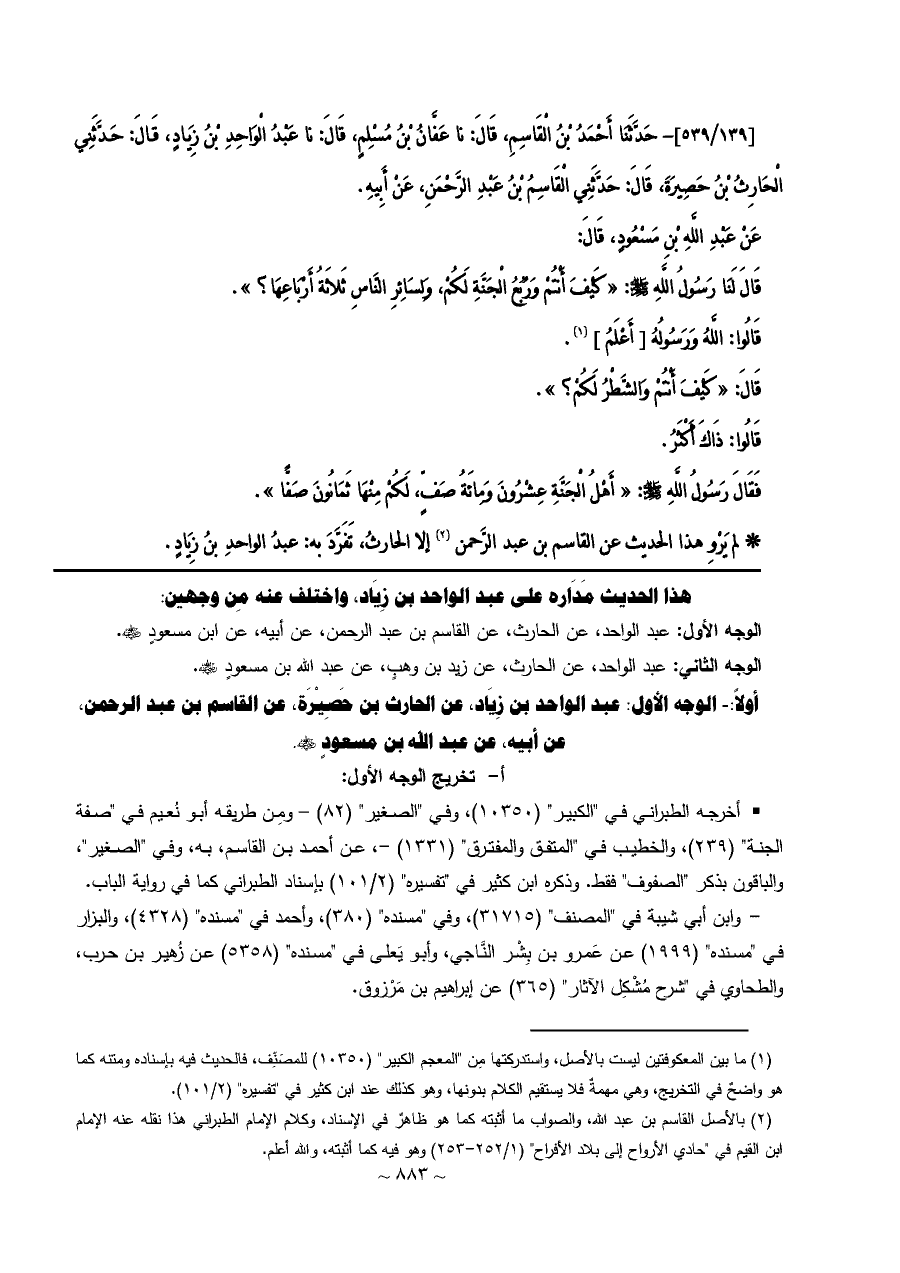أولاً: - الوجه الأول: عبد الواحد بن زِيَاد، عن الحارث بن حَصِيْرَة، عن القاسم بن عبد الرحمن، عن أبيه، عن عبد الله بن مسعودٍ - رضي الله عنه -.