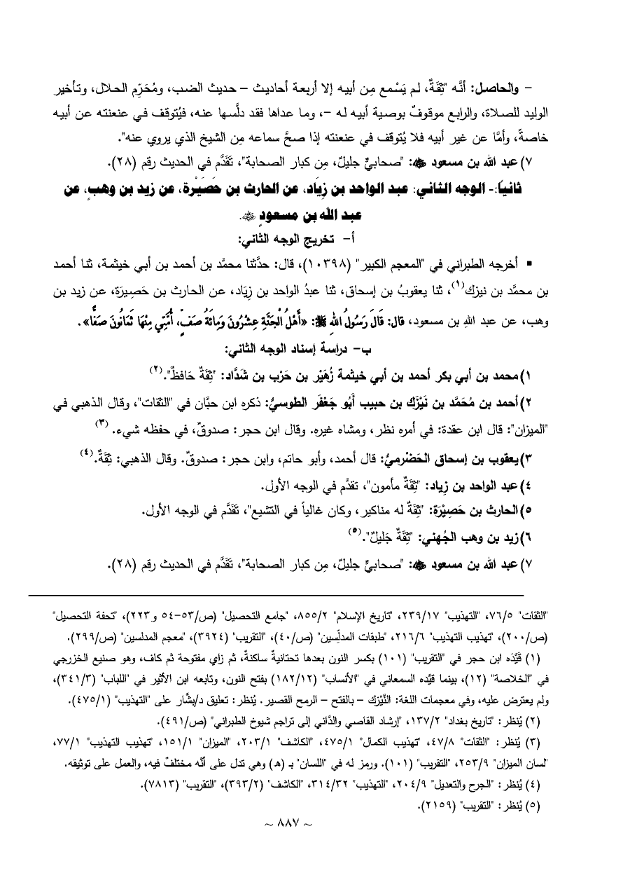 ثانياً: - الوجه الثاني: عبد الواحد بن زِيَاد، عن الحارث بن حَصَيْرة، عن زيد بن وهبٍ، عن عبد الله بن مسعودٍ - رضي الله عنه -.