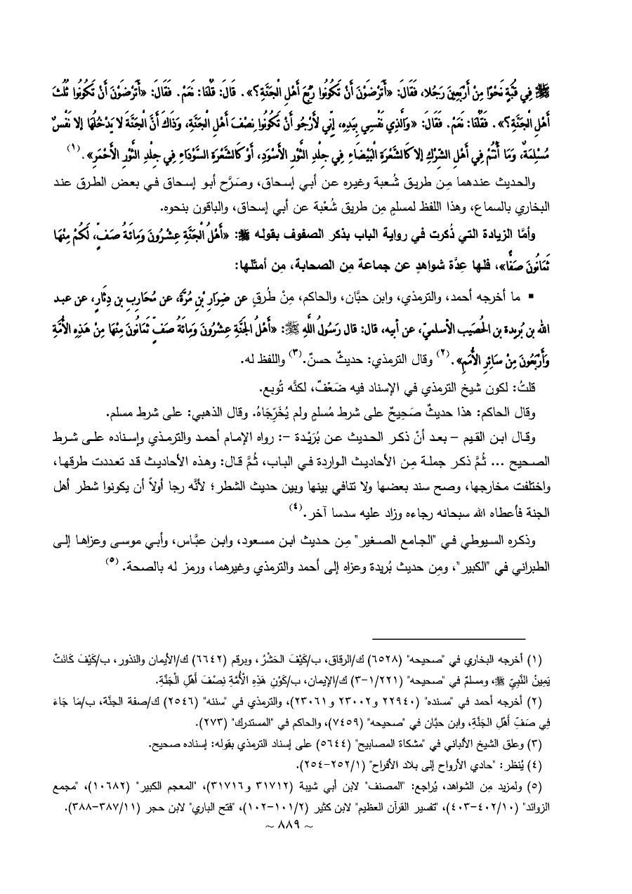 وقال ابن القيم - بعد أنْ ذكر الحديث عن بُرَيْدة -: رواه الإمام أحمد والترمذي وإسناده على شرط الصحيح ... ثُمَّ ذكر جملة مِن الأحاديث الواردة في الباب، ثُمَّ قال: وهذه الأحاديث قد تعددت طرقها، واختلفت مخارجها، وصح سند بعضها ولا تنافي بينها وبين حديث الشطر؛ لأنَّه رجا أولاً أن يكونوا شطر أهل الجنة فأعطاه الله سبحانه رجاءه وزاد عليه سدسا آخر. (¬٤)
