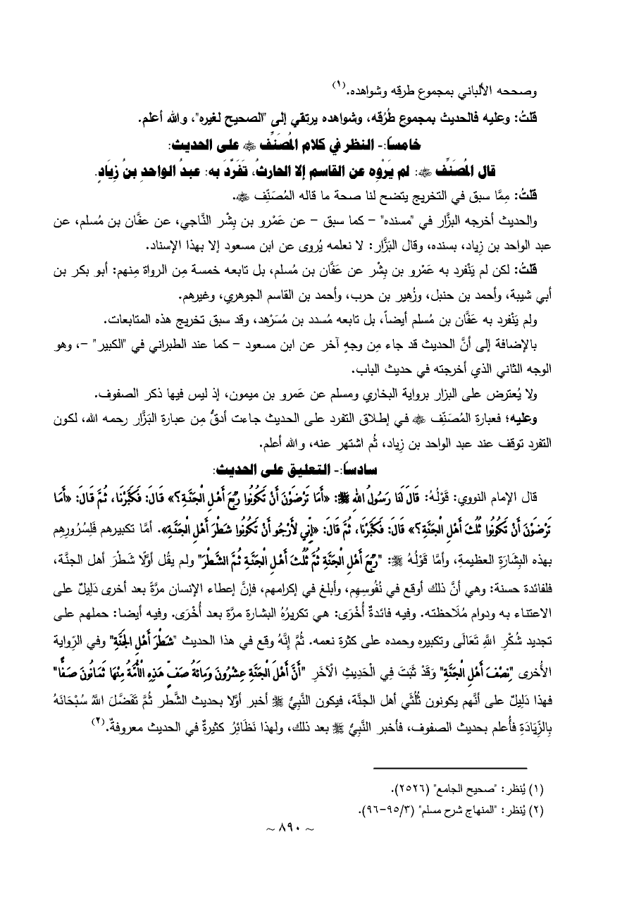 قلتُ: لكن لم يَنْفرد به عَمْرو بن بِشْر عن عَفَّان بن مُسلم، بل تابعه خمسة مِن الرواة مِنهم: أبو بكر بن أبي شيبة، وأحمد بن حنبل، وزُهير بن حرب، وأحمد بن القاسم الجوهري، وغيرهم.