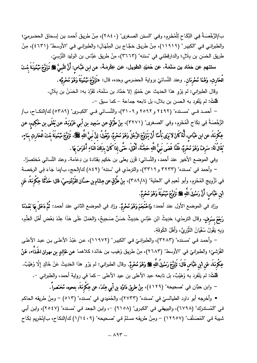 - وأحمد في "مسنده" (٣٢٣٣ و ٣٣١٩)، والترمذي في "سننه" (٨٤٢) ك/الحج، ب/مَا جَاءَ فِي الرخصة في تَزْوِيجِ المُحْرِمِ، وأبو نُعيم في "الحلية" (٨/ ٣٨٩)، مِنْ طُرُقٍ عن هِشَام بن حسَّان القَرْدُوسيّ، قال: حَدَّثَنَا عِكْرِمَةُ، عَنِ ابْنِ عَبَّاسٍ: أَنَّ رَسُولَ اللَّهِ - صلى الله عليه وسلم - تَزَوَّجَ مَيْمُونَةَ وَهُوَ مُحْرِمٌ.