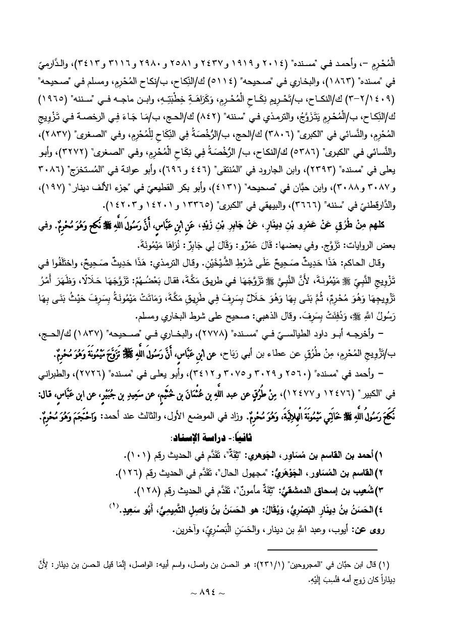 كلهم مِنْ طُرُقٍ عَنْ عَمْرِو بْنِ دِينَارٍ، عَنْ جَابِرِ بْنِ زَيْدٍ، عَنِ ابْنِ عَبَّاسٍ، أَنَّ رَسُولَ اللَّهِ - صلى الله عليه وسلم - نَكح وَهُوَ مُحْرِمٌ. وفي بعض الروايات: تَزَوَّج. وفي بعضها: قَالَ عَمْرٌو: وَقَالَ لِي جَابِرٌ: نُرَاهَا مَيْمُونَةَ.