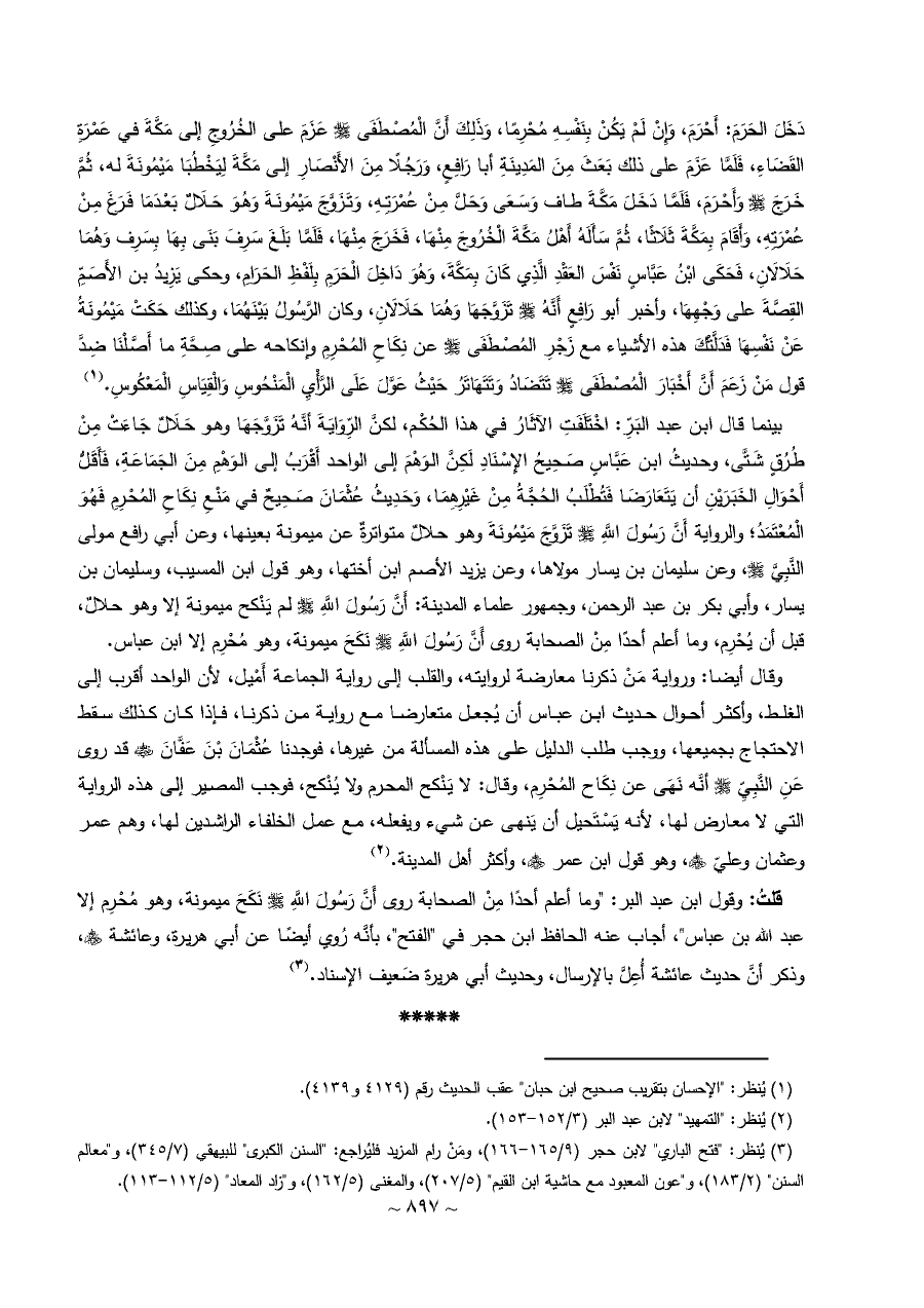 بينما قال ابن عبد البَرِّ: اخْتَلَفَتِ الآثَارُ في هذا الحُكْم، لكنَّ الرِّوَايَةَ أنَّهُ تَزَوَّجَهَا وهو حَلَالٌ جَاءَتْ مِنْ طُرُقٍ شَتَّى، وحديثُ ابن عَبَّاسٍ صَحِيحُ الإِسْنَادِ لَكِنَّ الوَهْمَ إلى الواحد أَقْرَبُ إلى الوَهْمِ مِنَ الجَمَاعَةِ، فَأَقَلُّ أَحْوَالِ الخَبَرَيْنِ أن يَتَعَارَضَا فَتُطْلَبُ الحُجَّةُ مِنْ غَيْرِهِمَا، وَحَدِيثُ عُثْمَانَ صَحِيحٌ في مَنْعِ نِكَاحِ المُحْرِمِ فَهُوَ الْمُعْتَمَدُ؛ والرواية أَنَّ رَسُولَ اللَّهِ - صلى الله عليه وسلم - تَزَوَّجَ مَيْمُونَةَ وهو حلالٌ متواترةٌ عن ميمونة بعينها، وعن أبي رافع مولى النَّبِيَّ - صلى الله عليه وسلم -، وعن سليمان بن يسار مولاها، وعن يزيد الأصم ابن أختها، وهو قول ابن المسيب، وسليمان بن يسار، وأبي بكر بن عبد الرحمن، وجمهور علماء المدينة: أَنَّ رَسُولَ اللَّهِ - صلى الله عليه وسلم - لم يَنْكح ميمونة إلا وهو حلالٌ، قبل أن يُحْرِم، وما أعلم أحدًا مِنْ الصحابة روى أَنَّ رَسُولَ اللَّهِ - صلى الله عليه وسلم - نَكَحَ ميمونة، وهو مُحْرِم إلا ابن عباس.