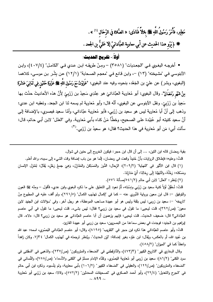 • أخرجه البغوي في "الجعديات" (٣٥٨١) - ومِنْ طريقه ابن عدي في "الكامل" (٤/ ٤٠٧)، وابن الآبنوسي في "مشيخته" (١٣) -، وابن قانع في "معجم الصحابة" (١/ ١٢) عن بِشْر بن موسى، كلاهما (البغوي، وبشر) عن عليِّ بن الجَعْد، بنحوه، وفيه عند البغوي: "غَزَوْتُ مَعَ رَسُولِ اللَّهِ - صلى الله عليه وسلم - غَزْوَةَ حُنَيْنٍ فِي ثَمَانِيَ عَشْرَةَ مِنْ شَهْرِ رَمَضَانَ". وقال البغوي: أبو مُعَاوية العبَّادانيّ هو عِنْدِي سَعِيدُ بن زَرْبِيٍّ لِأَنَّ هذه الأحاديثَ حدَّث بها سَعِيدُ بن زَرْبِيٍّ. ونقل الآبنوسي عن البغوي، أنَّه قال: وأبو مُعاوية لم يسمه لنا ابن الجعد. وتعقبه ابن عدي: وذهب إلى أنَّ أبا مُعاوية ليس هو سعيد بن زَرْبي، فأبو مُعاوية عبَّاداني، وأمَّا سعيد فبصري، بالإضافة إلى أنَّ سعيد كنيته أبو عُبَيْدة على الصحيح، وخطَّأ مَنْ كناه بأبي مُعاوية. وفي "العلل" لابن أبي حاتم، قال: سألت أبي: مَن أبو مُعاوية في هذا الحديث؟ فقال: هو سعيدُ بن زَرْبي. (¬٢)