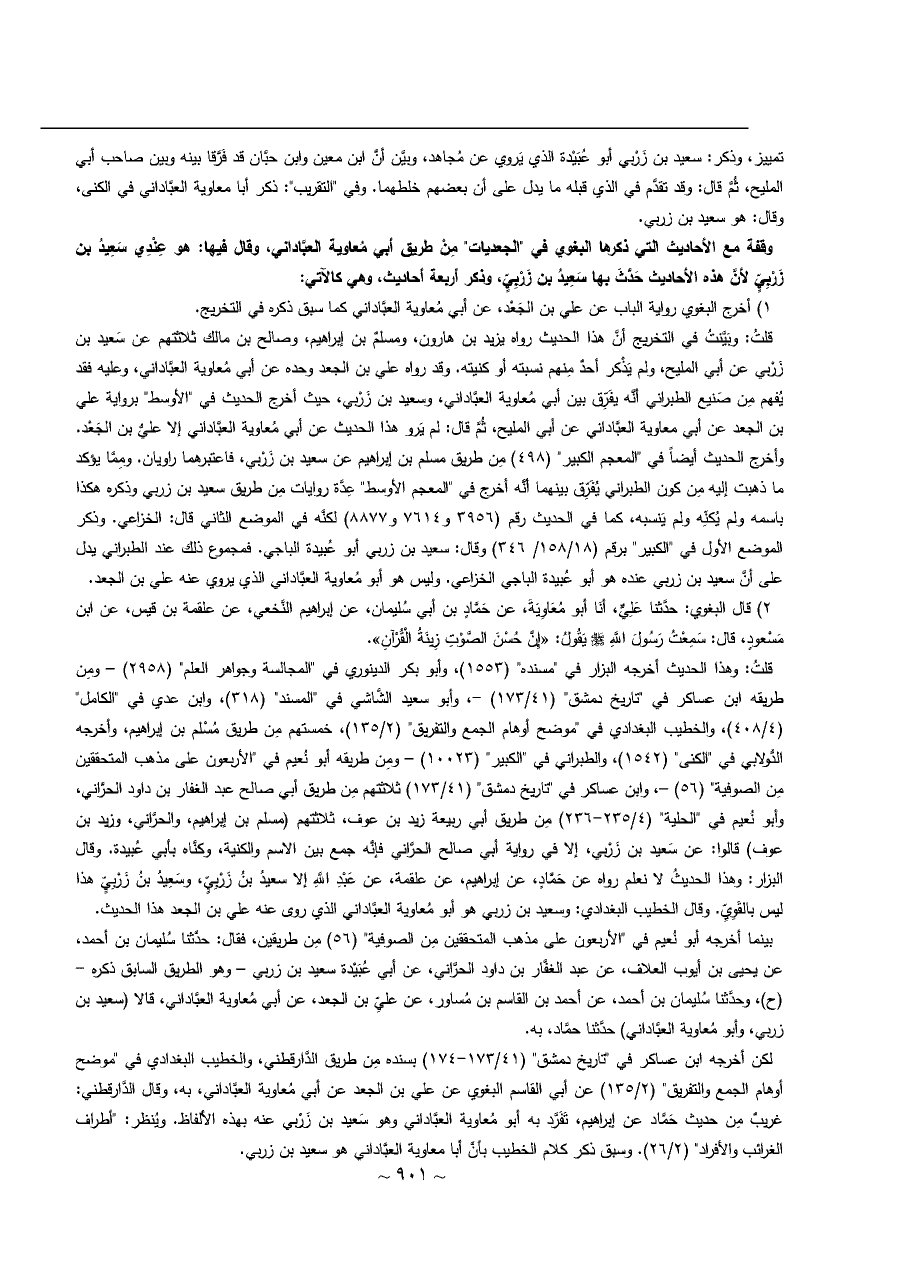 قلتُ: وبَيَّنتُ في التخريج أنَّ هذا الحديث رواه يزيد بن هارون، ومسلمٌ بن إبراهيم، وصالح بن مالك ثلاثتهم عن سَعيد بن زَرْبي عن أبي المليح، ولم يَذْكر أحدٌ مِنهم نسبته أو كنيته. وقد رواه علي بن الجعد وحده عن أبي مُعاوية العبَّاداني، وعليه فقد يُفهم مِن صَنيع الطبراني أنَّه يفَرِّق بين أبي مُعاوية العبَّاداني، وسعيد بن زَرْبي، حيث أخرج الحديث في "الأوسط" برواية علي بن الجعد عن أبي معاوية العبَّاداني عن أبي المليح، ثُمَّ قال: لم يَرو هذا الحديث عن أبي مُعاوية العبَّاداني إلا عليُّ بن الجَعْد. وأخرج الحديث أيضاً في "المعجم الكبير" (٤٩٨) مِن طريق مسلم بن إبراهيم عن سعيد بن زَرْبي، فاعتبرهما راويان. ومِمَّا يؤكد ما ذهبت إليه مِن كون الطبراني يُفَرِّق بينهما أنَّه أخرج في "المعجم الأوسط" عِدَّة روايات مِن طريق سعيد بن زربي وذكره هكذا باسمه ولم يُكنِّه ولم يَنسبه، كما في الحديث رقم (٣٩٥٦ و ٧٦١٤ و ٨٨٧٧) لكنَّه في الموضع الثاني قال: الخزاعي. وذكر الموضع الأول في "الكبير" برقم (١٨/ ١٥٨/ ٣٤٦) وقال: سعيد بن زربي أبو عُبيدة الباجي. فمجموع ذلك عند الطبراني يدل على أنَّ سعيد بن زربي عنده هو أبو عُبيدة الباجي الخزاعي. وليس هو أبو مُعاوية العبَّاداني الذي يروي عنه علي بن الجعد. ...